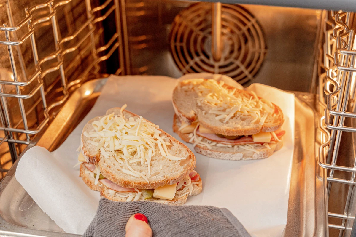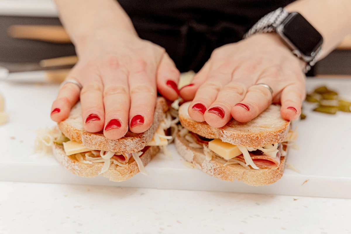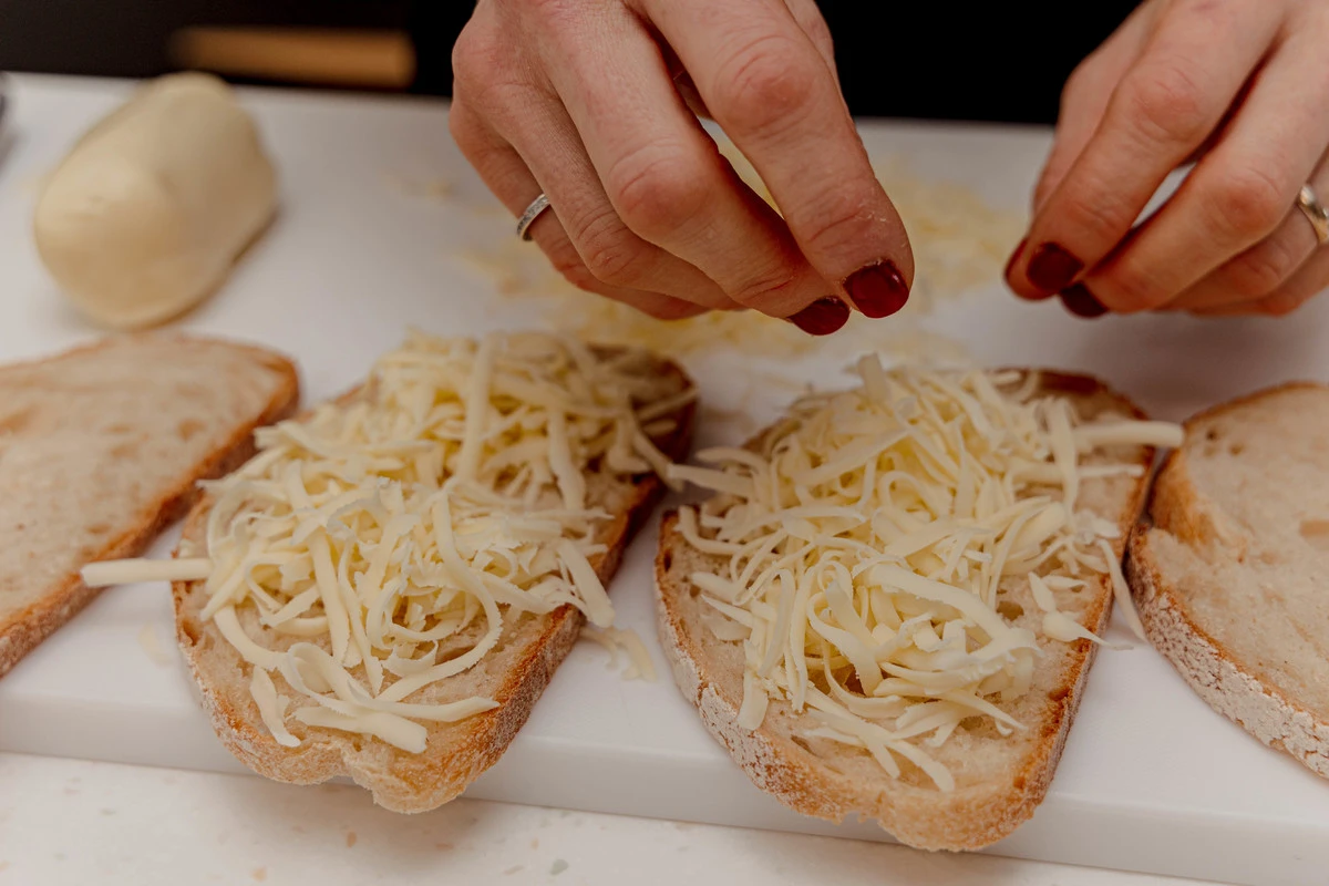 Прижмите вторым куском хлеба и добавьте ещё немного тёртой моцареллы. У вас должно получиться два многослойных бутерброда.