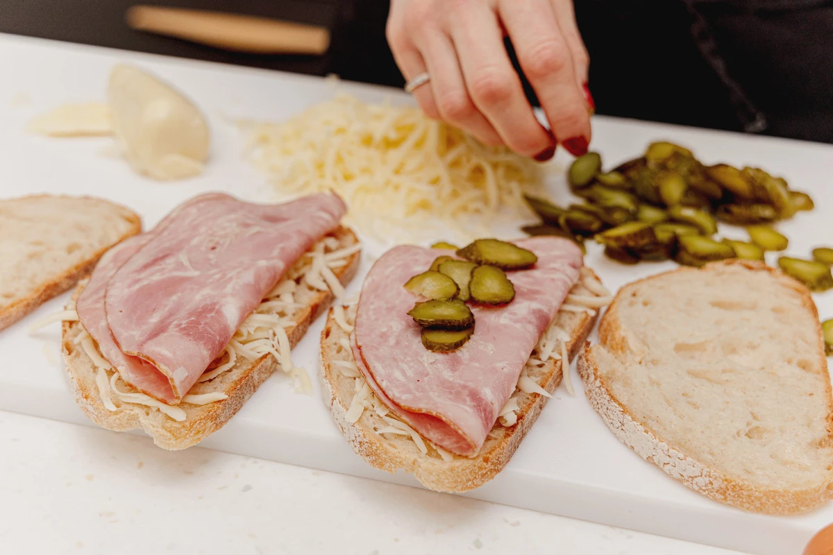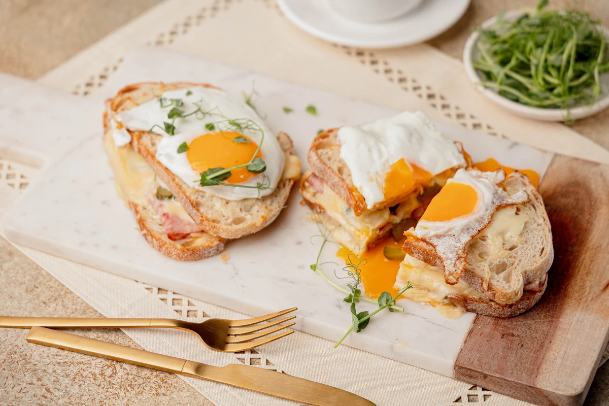 Очень, очень сытный бутерброд. Много расплавленного сыра, ветчина и жидкий желток на горячем хлебе.