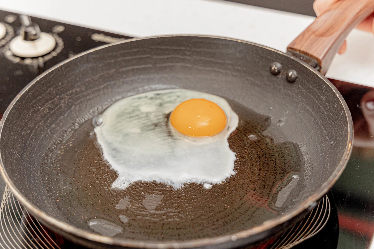 Пока тосты пекутся, быстро поджарьте две глазуньи на сковороде.