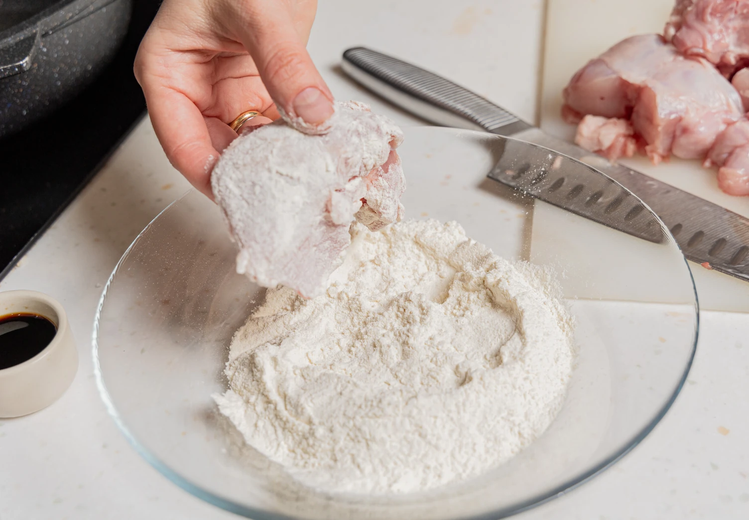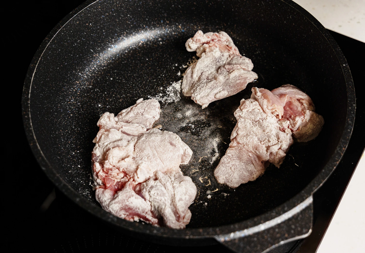 Разогрейте на сковороде растительное масло. Обжарьте мясо на разогретой сковороде партиями до румяной корочки со всех сторон. Не выкладывайте все куски сразу, иначе они будут тушиться, а не жариться.
