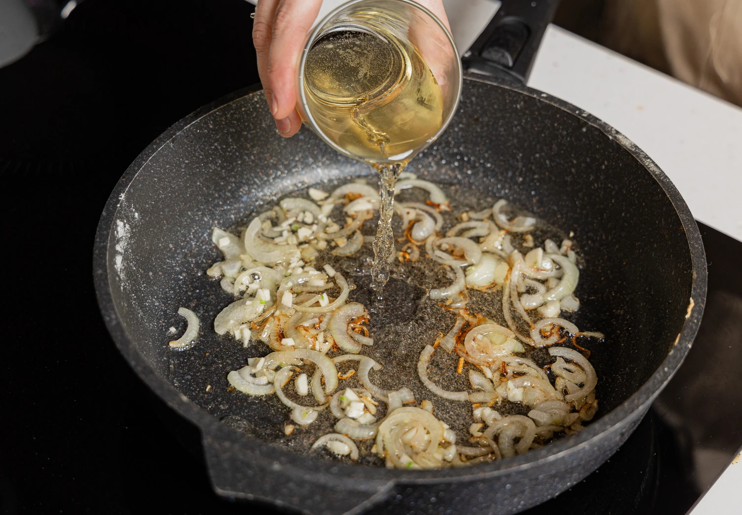 Добавьте к луку чеснок, влейте белое вино и готовьте, пока алкоголь не выпарится.