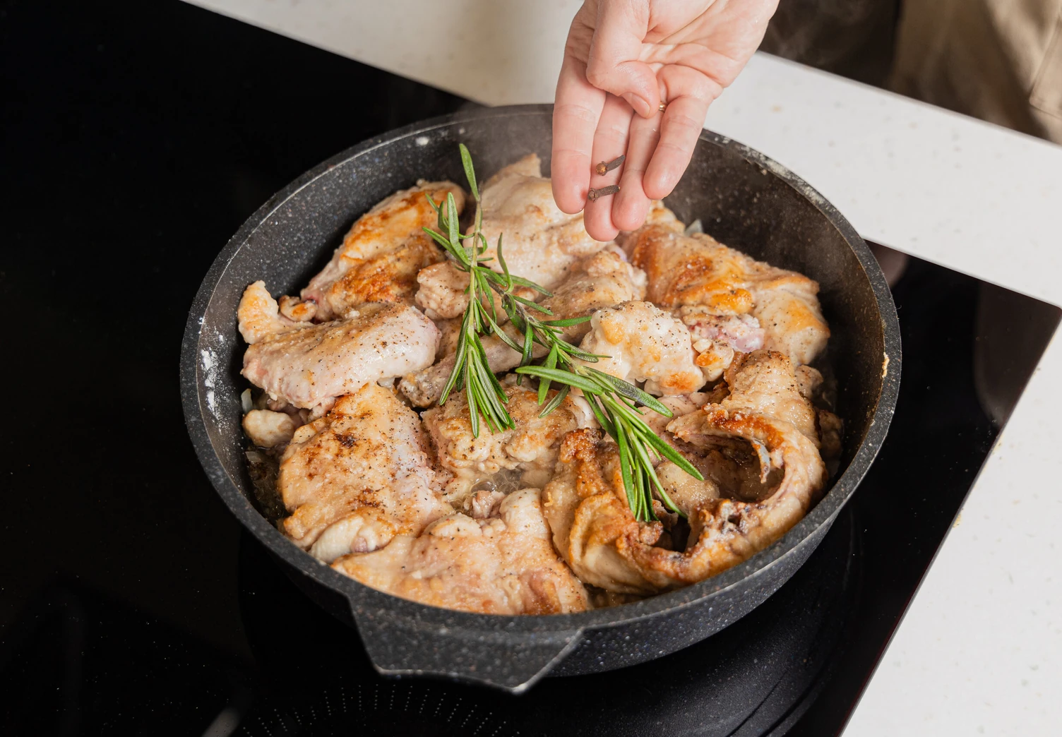 Верните в сковороду обжаренное мясо. Добавьте соль, чёрный перец, орегано и розмарин. Тушите под крышкой около часа, пока мясо не станет мягким.