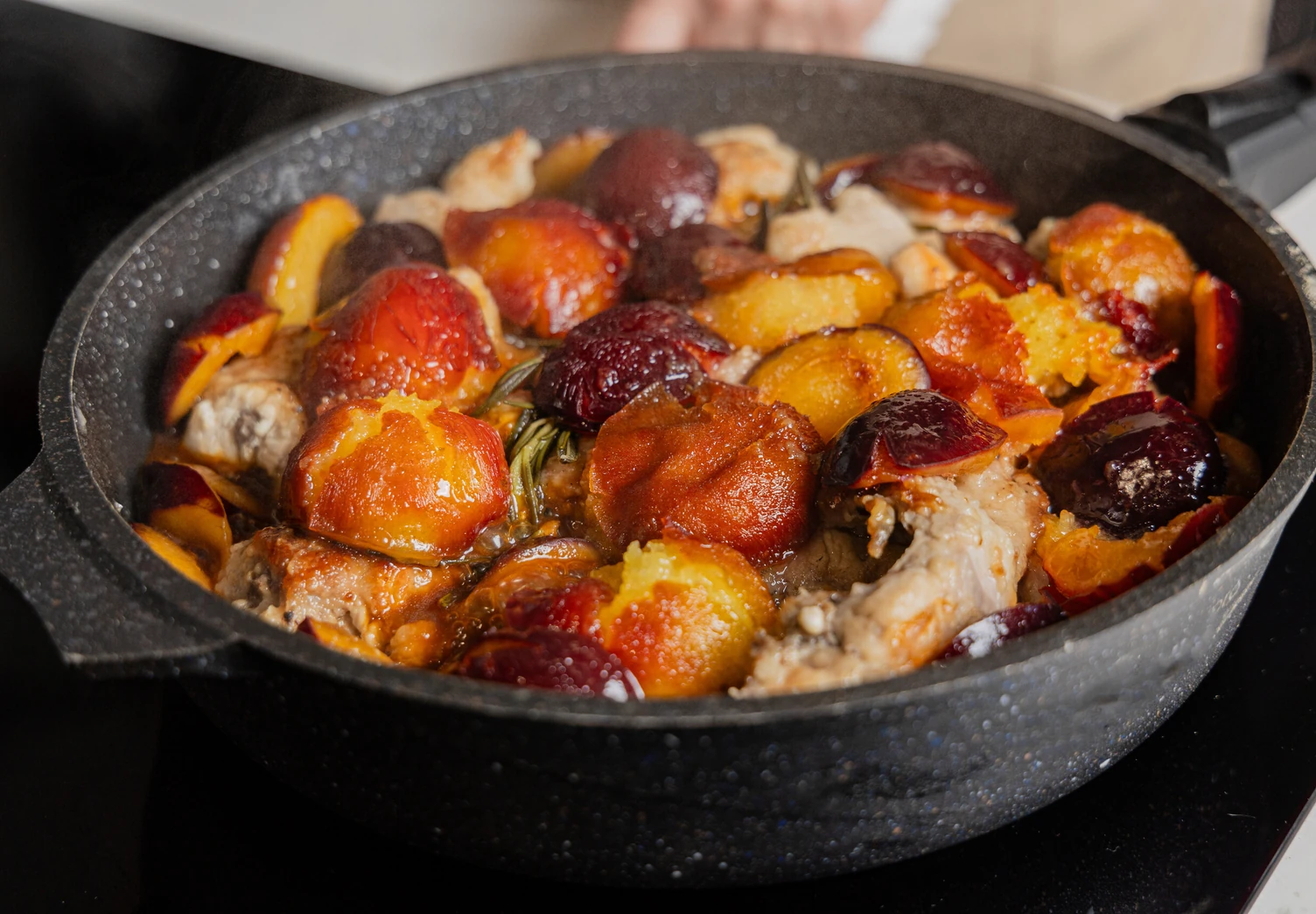 Добавьте в сковороду нарезанные сливы и готовьте ещё 15 минут под крышкой.