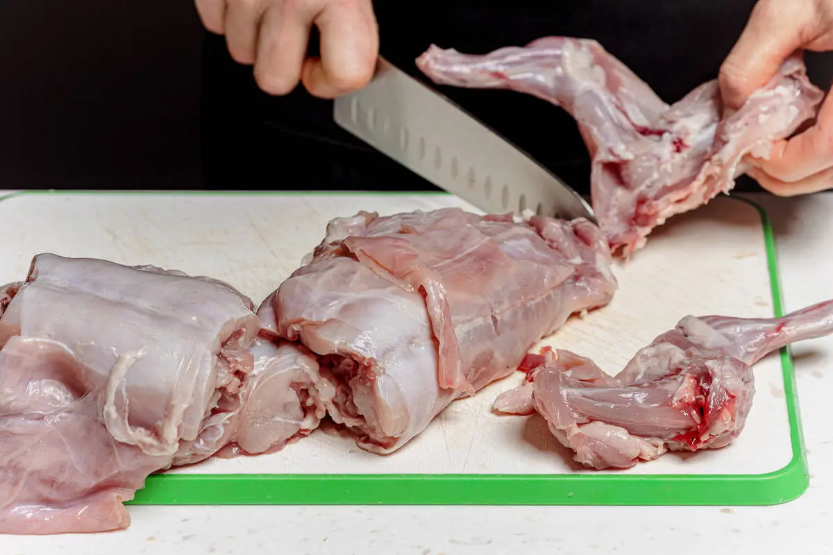 Кролика разморозьте заранее в холодильнике в течение 6-7 часов. Нарежьте тушку на порционные куски.