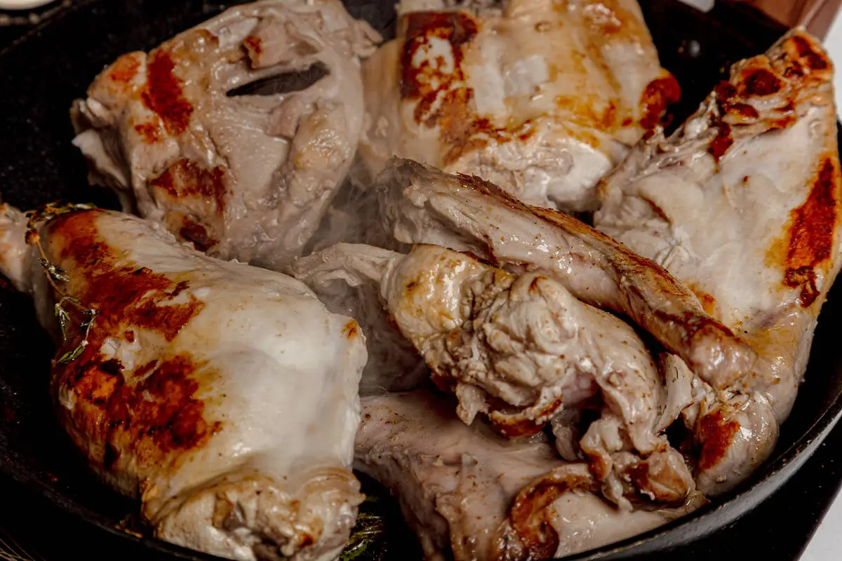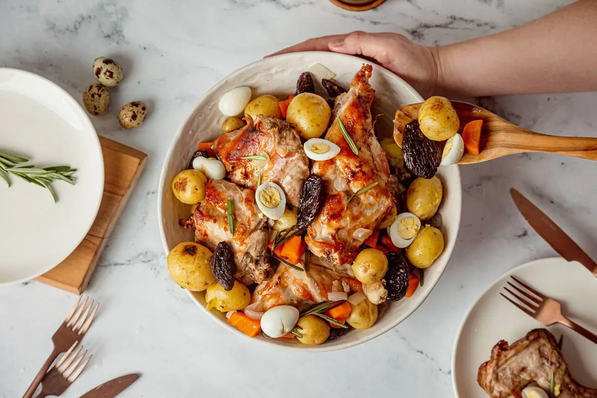 Ароматный кролик в вине с румяной картошкой, черносливом, травами и перепелиными яйцами — настоящее украшение праздничного стола.