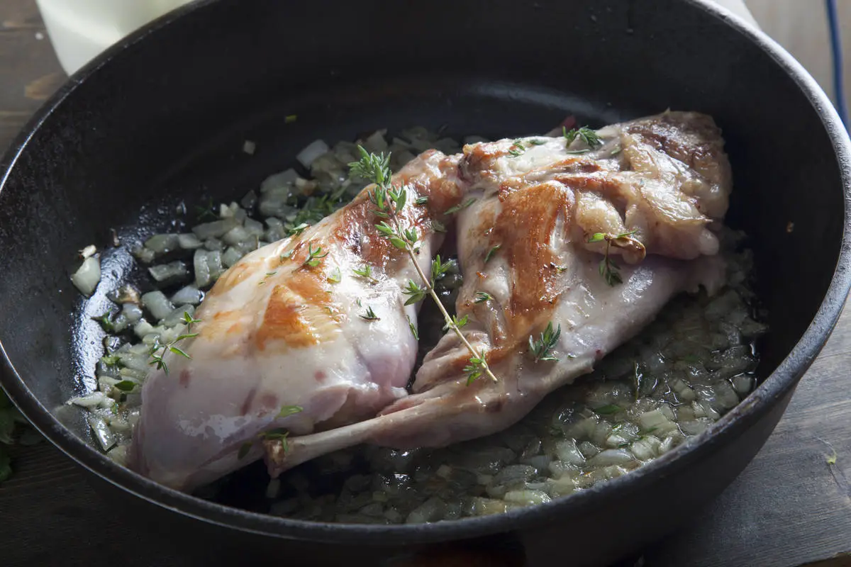 В оставшемся масле спассеруйте на небольшом огне мелко нарезанный лук до прозрачности, верните окорочка в сковороду и влейте вино, дайте ему выпариться, долейте немного воды, положите тимьян, накройте сковороду крышкой и тушите 15-20 минут.