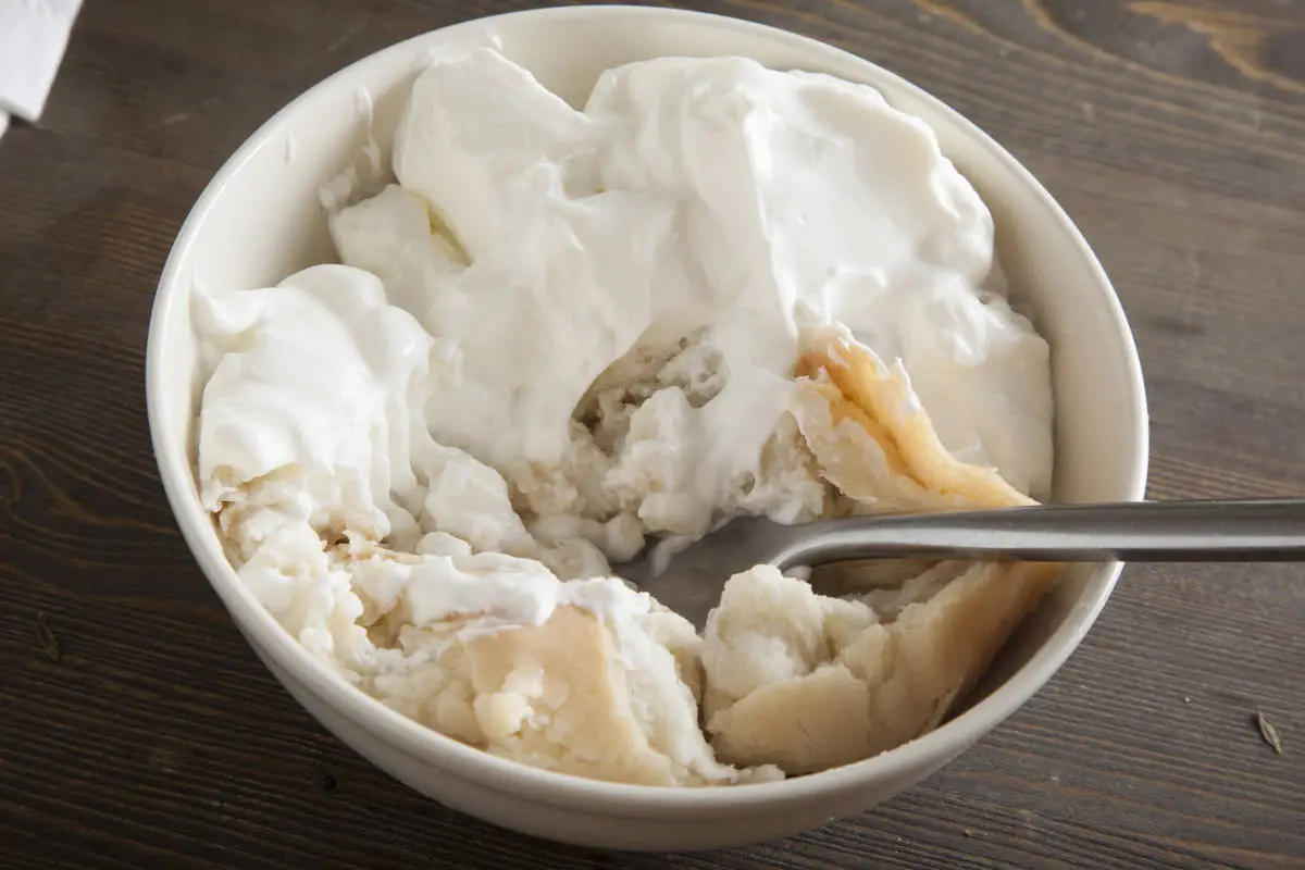 Отожмите хлеб от лишней жидкости, соедините со сметаной и разомните вилкой до однородности, посолите по вкусу, добавьте пропущенный через пресс чеснок.
