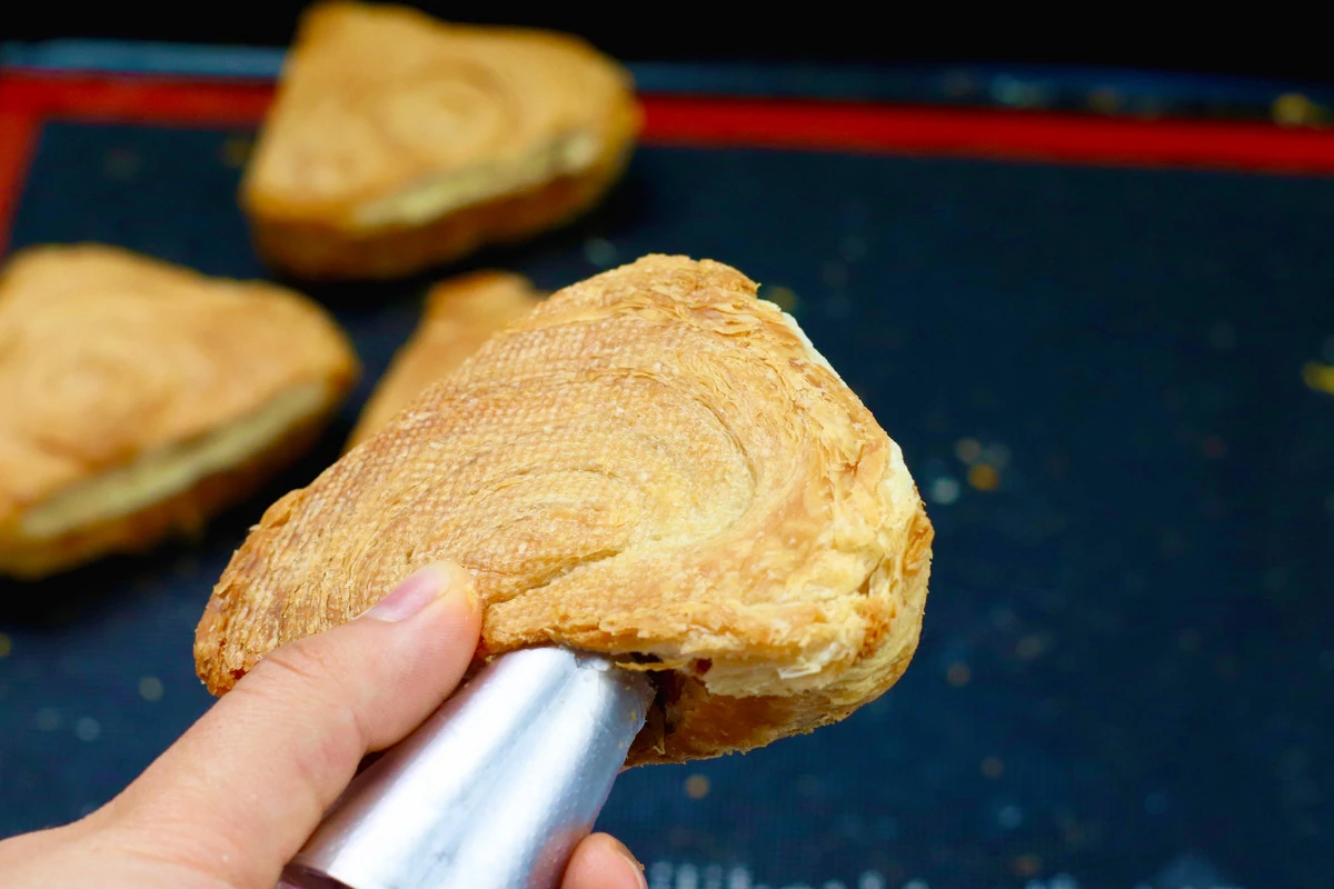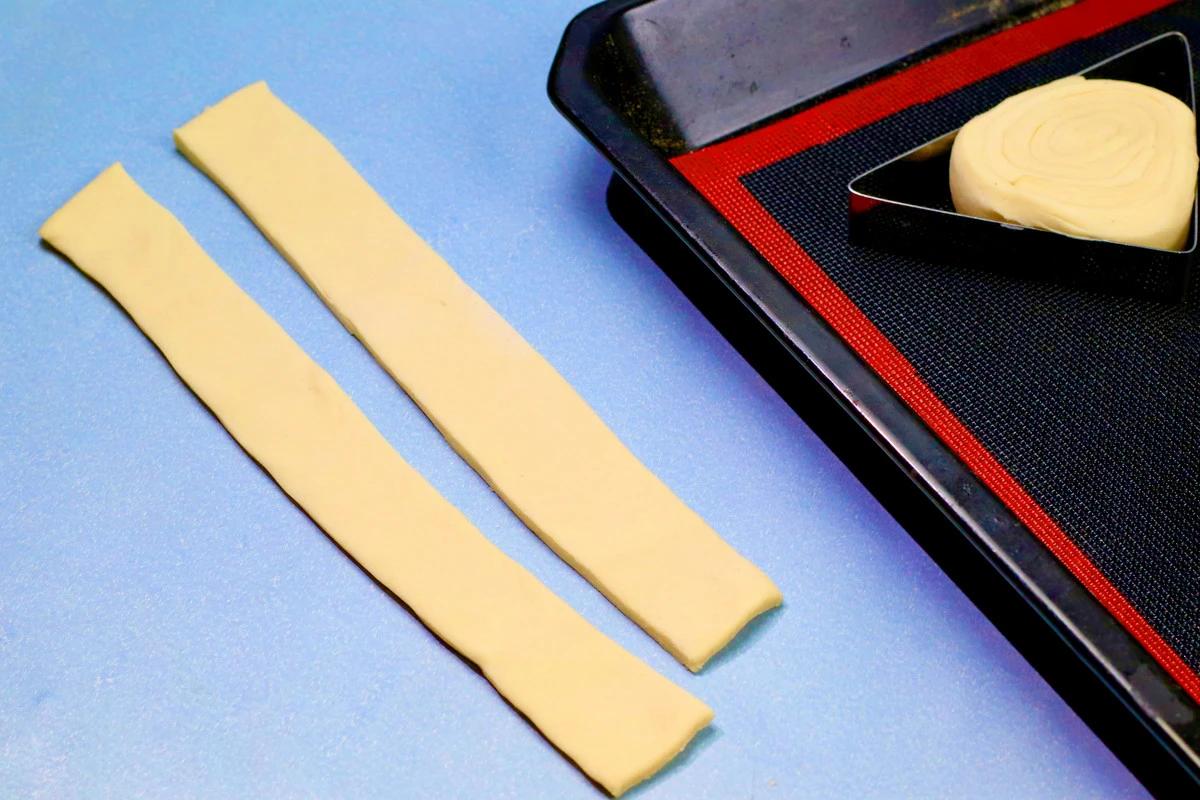 Разрежьте слоёное тесто на равные полоски толщиной около 2 см.