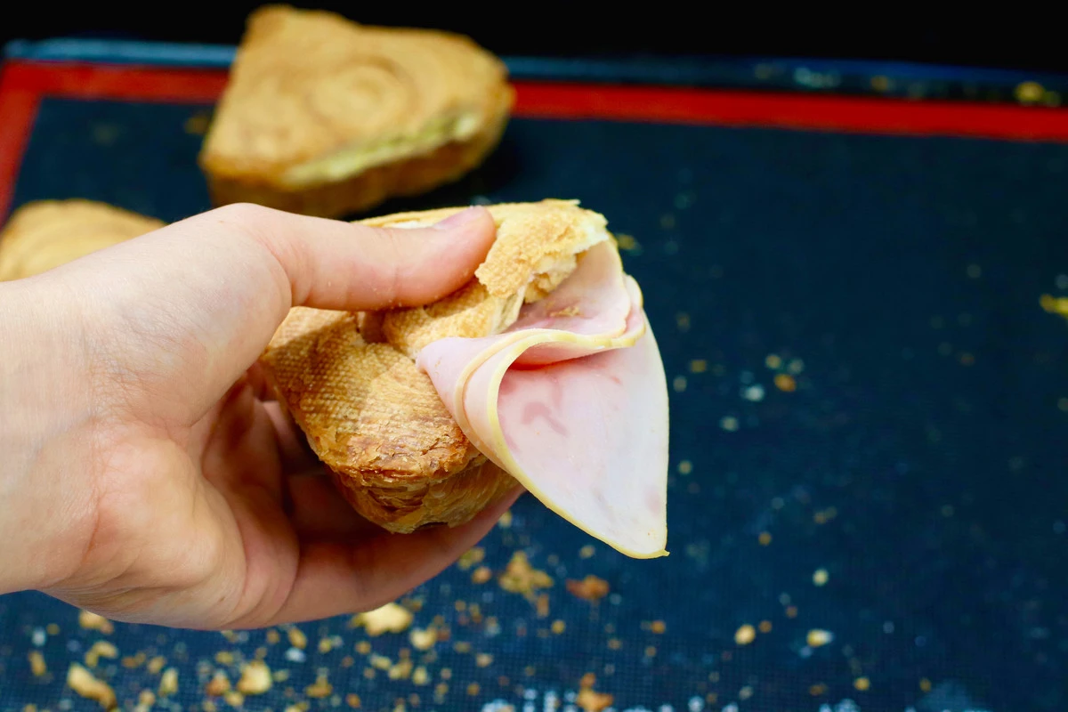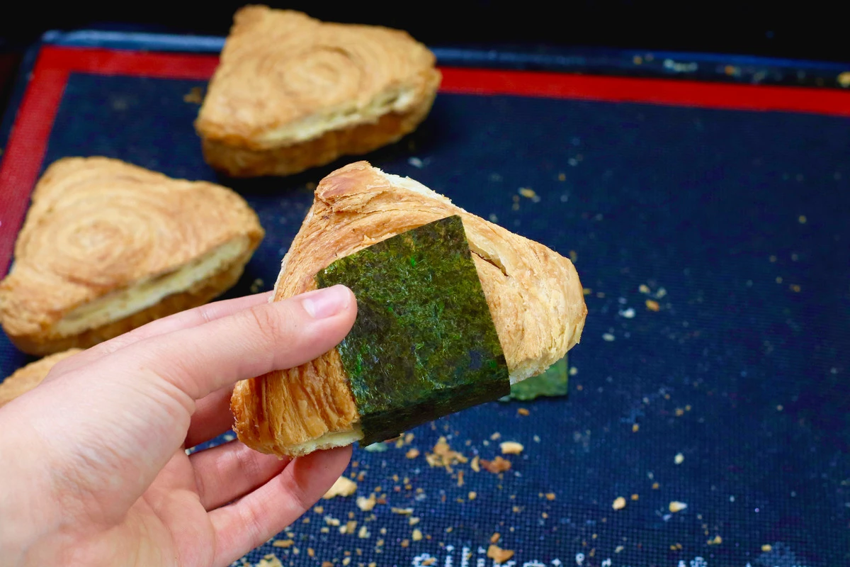 Тренд в мире фастфуда, который становится всё популярнее. Кронигири сочетает в себе японскую и европейские кулинарные традиции, а само название «кронигири» образовано от слов «круассан» и «онигири». Можно делать кронигири с любой начинкой, мы выбрали мясную нарезку.