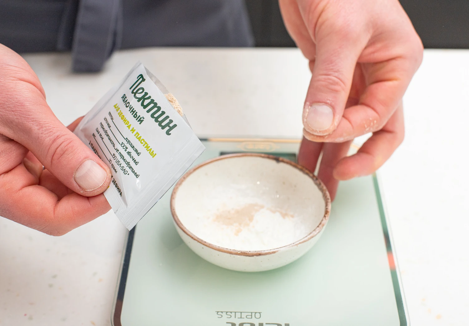 Пектин смешайте со второй порцией сахара, добавьте 50 мл воды и прогрейте до полного растворения.