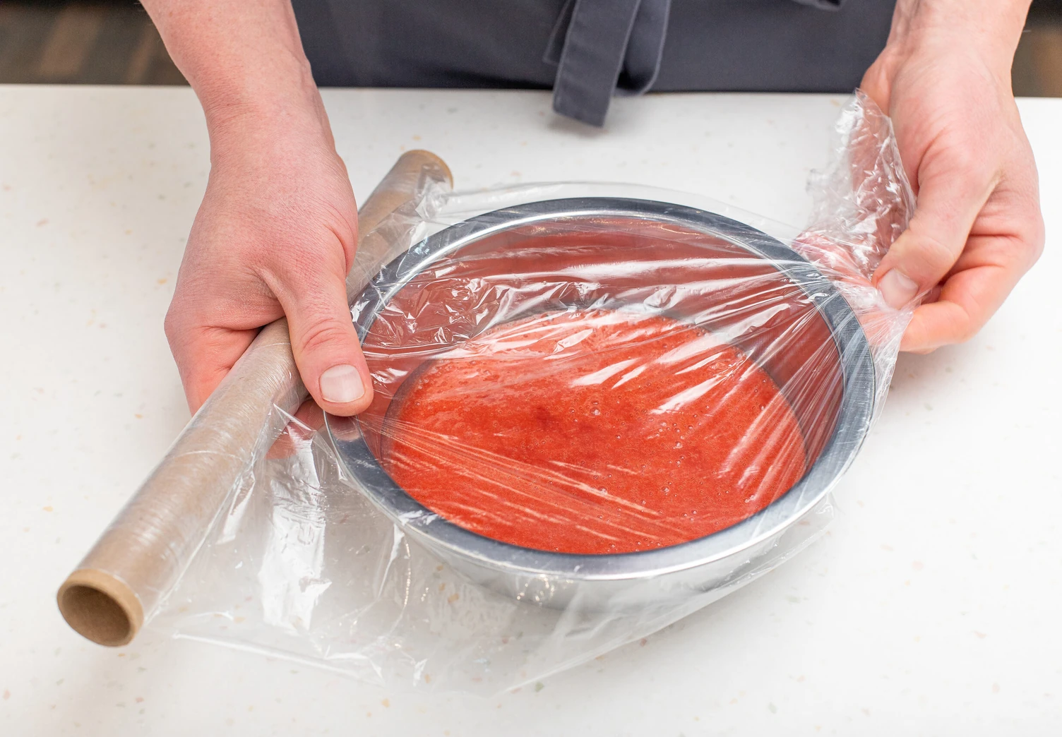 Готовую начинку пробейте блендером с эмульсионной насадкой до гладкой, однородной массы. Накройте миску с массой пищевой плёнкой в контакт и уберите в холодильник.