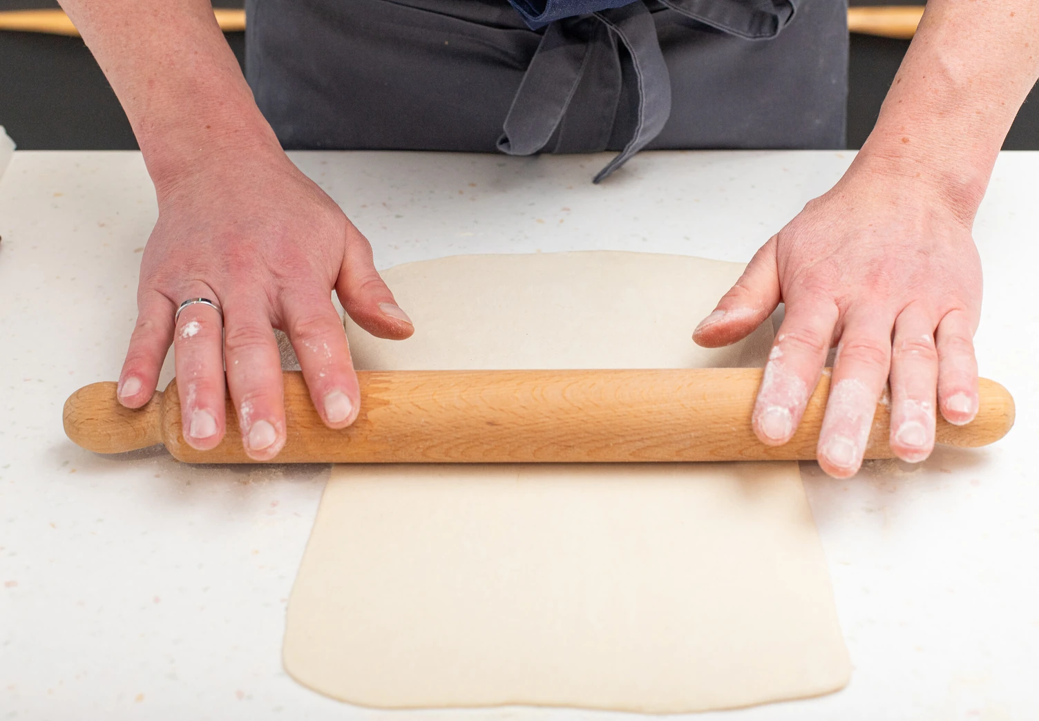 Разморозьте слоёное тесто по инструкции на упаковке и раскатайте в пласт толщиной около 3 мм.