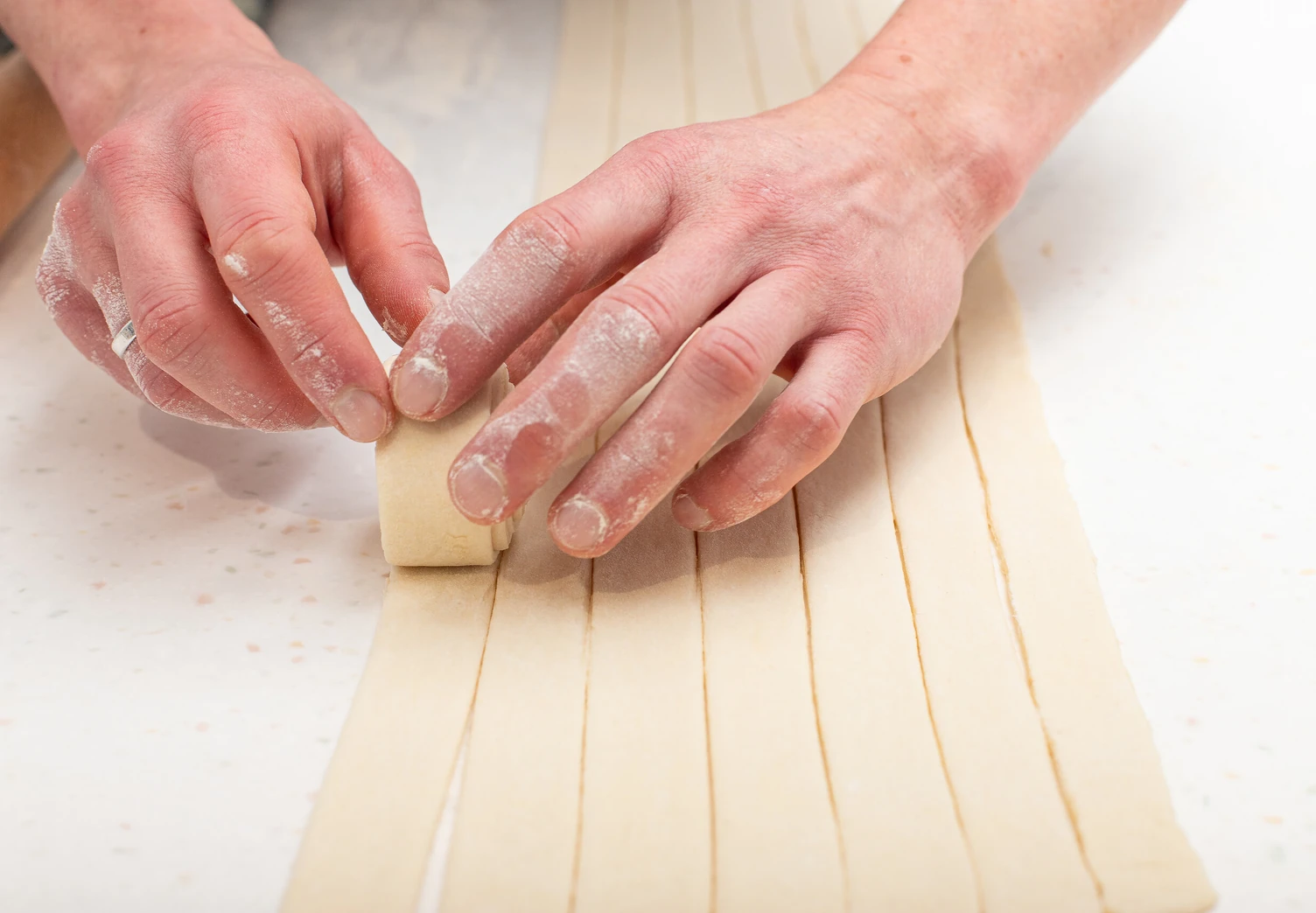 Разделите тесто на полоски шириной 2,5–3 см и скрутите их в улитки.