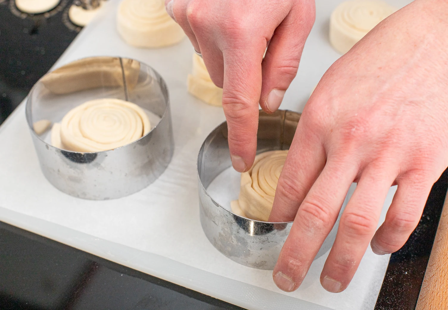 Полученные заготовки выложите на застеленный пергаментом противень и накройте пищевой плёнкой. Оставьте на 15–20 минут для расстойки — чтобы тесто подошло и увеличилось в объёме непосредственно перед выпечкой.