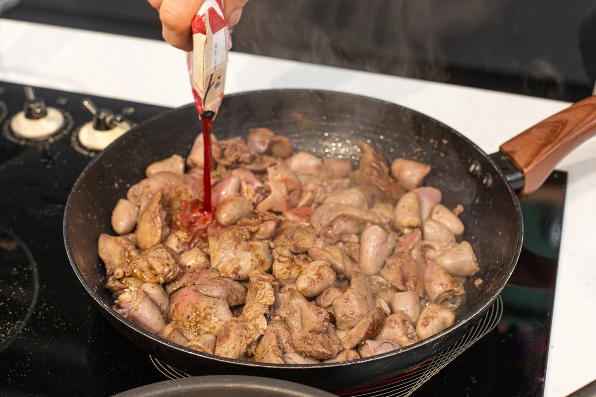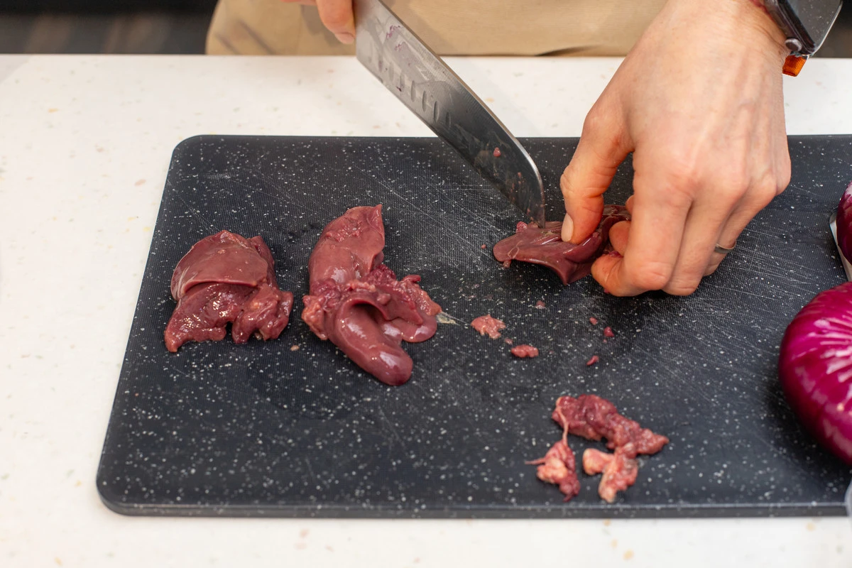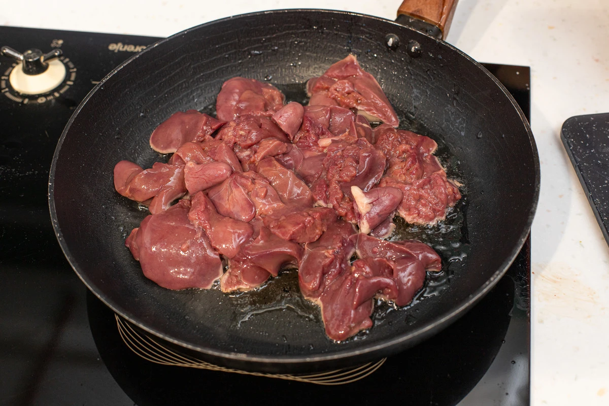 Нарежьте печень, удалив плёнки и протоки. У сердечек срежьте жирок и сосуды, удалите сгустки крови, если остались.