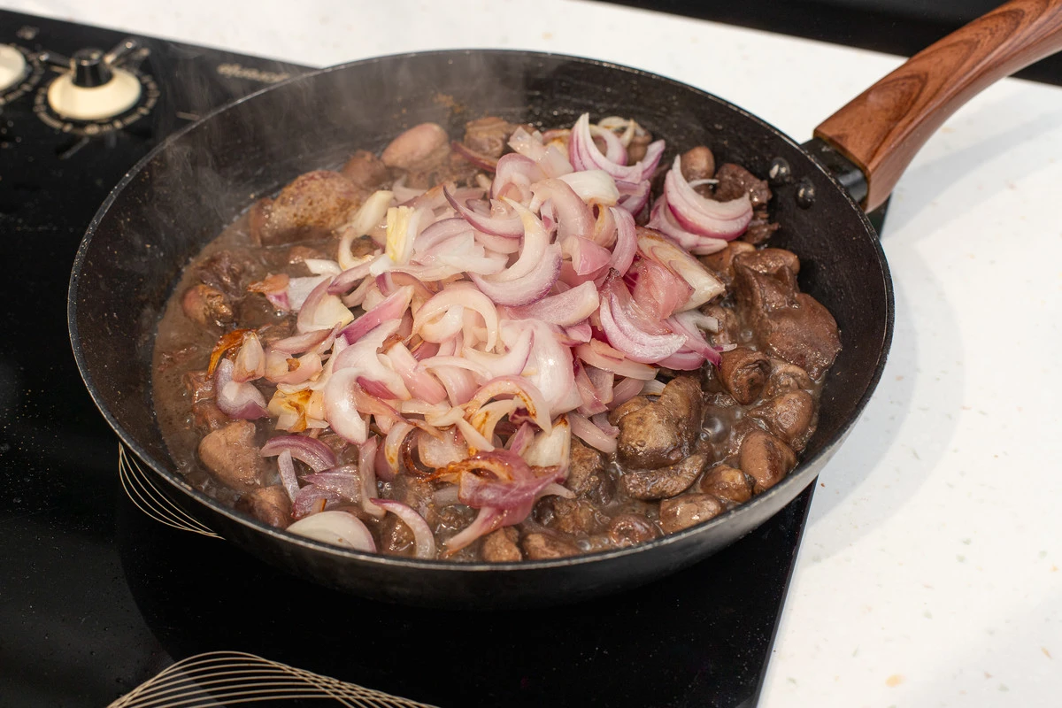 Лук нарежьте перьями, орехи мелко порубите. Добавьте лук и орехи к потрошкам, перемешайте и тушите всё вместе ещё примерно 7–10 минут, при необходимости помешивая.