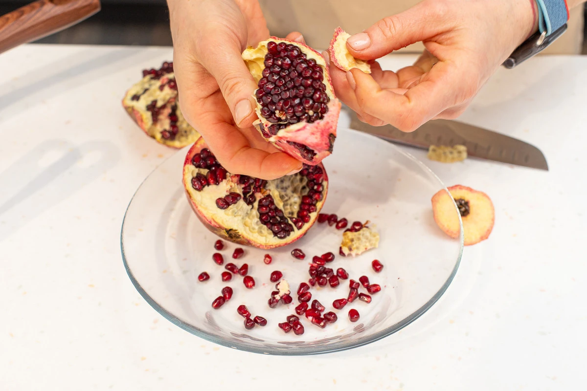 Очистите гранат, разберите на зёрна. Мелко порубите кинзу. Можно также добавить немного мяты. Подавайте кучмачи, украсив зёрнами граната и рубленой зеленью.