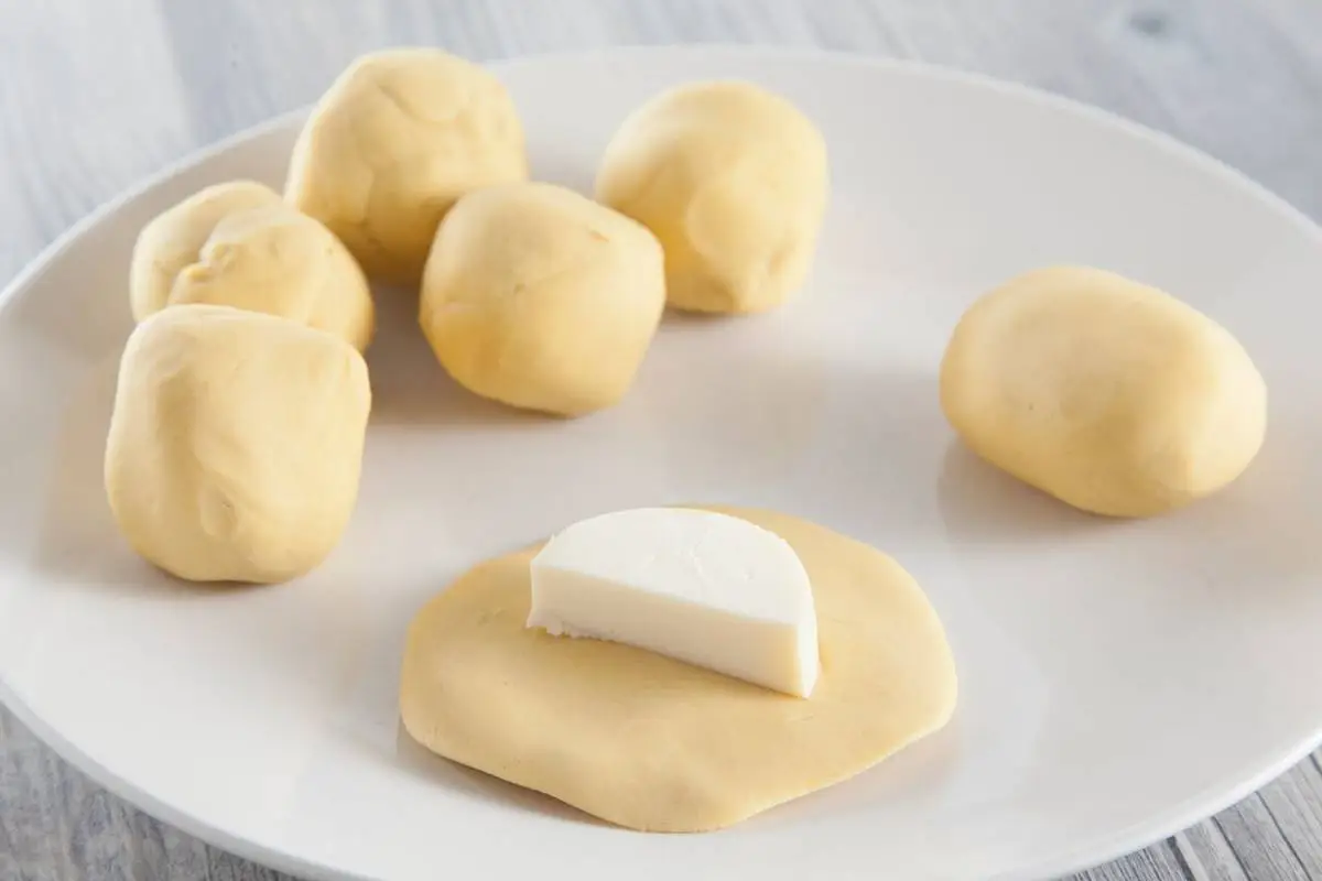Моцареллу нарежьте толстыми половинками кружочков, тесто разделите по количеству кусочков.