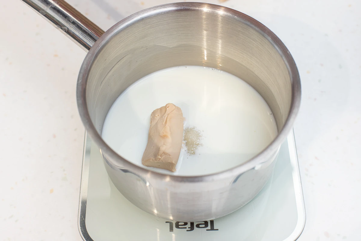 Сделайте опару. Для этого налейте молоко в ковш, нагрейте до температуры 36-38 ℃, но не больше (молоко, если его капнуть на палец, должно быть чуть тёплым). Всыпьте сахар и добавьте дрожжи (можно предварительно нарезать их произвольно), а также 1 ст. ложку муки из общего количества. Перемешайте венчиком до однородности и оставьте в тёплом месте без сквозняков на 10-15 минут до появления пенки.