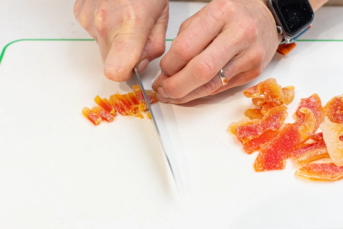 Папайю нарежьте. Вишню замочите в кипятке примерно на 10 минут. В принципе, вы можете взять любые сухофрукты по вкусу, но общим весом 150 г.