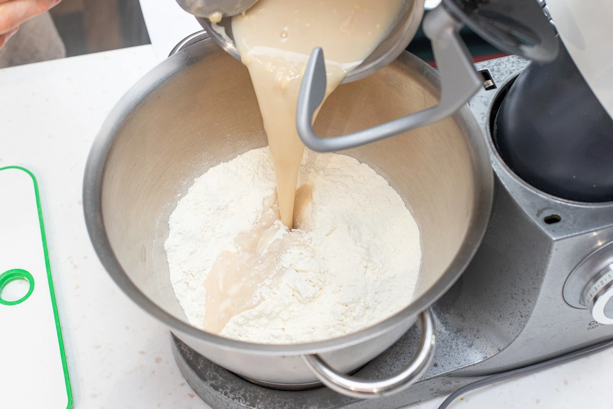 В чашу миксера всыпьте всю остальную муку, щепотку соли. А затем влейте подготовленную и подошедшую опару. Важно: в опару соль добавлять нельзя, тесто для кулича не получится.