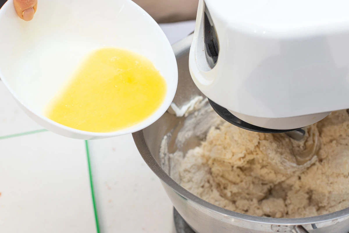 Сливочное масло растопите и также добавьте в тесто. Перемешайте всё на низкой скорости миксера с помощью насадки-крюка до однородности. Добавьте сметану комнатной температуры и снова перемешайте миксером.