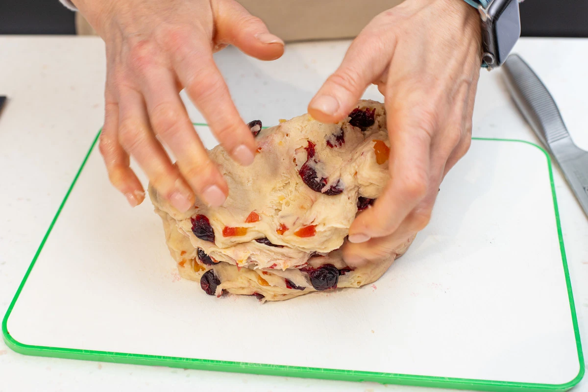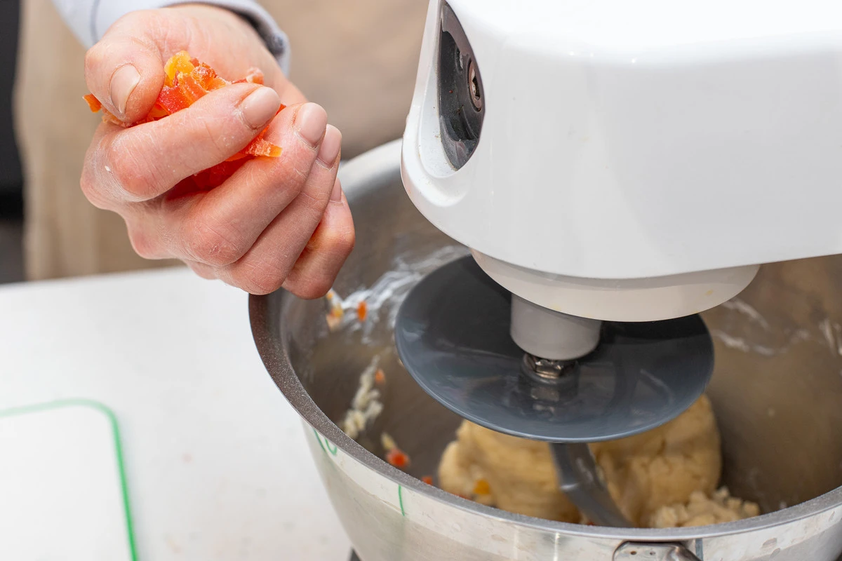 С вишни слейте воду, обсушите ягоды бумажным полотенцем и добавьте вместе с нарезанной папайей в тесто. Перемешайте миксером с насадкой-крюком до соединения компонентов.