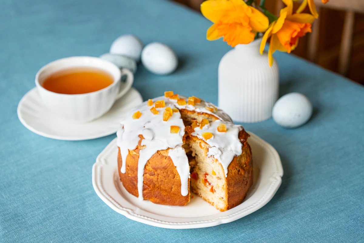 Кулич может быть вкусным и без яиц. Мы сделали опару на свежих дрожжах и добавили в тесто сметану — получилась отличная пасхальная выпечка.