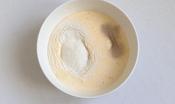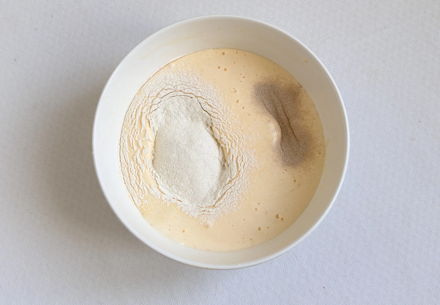 Добавьте тёплое растопленное сливочное масло, молоко, дрожжи и муку.