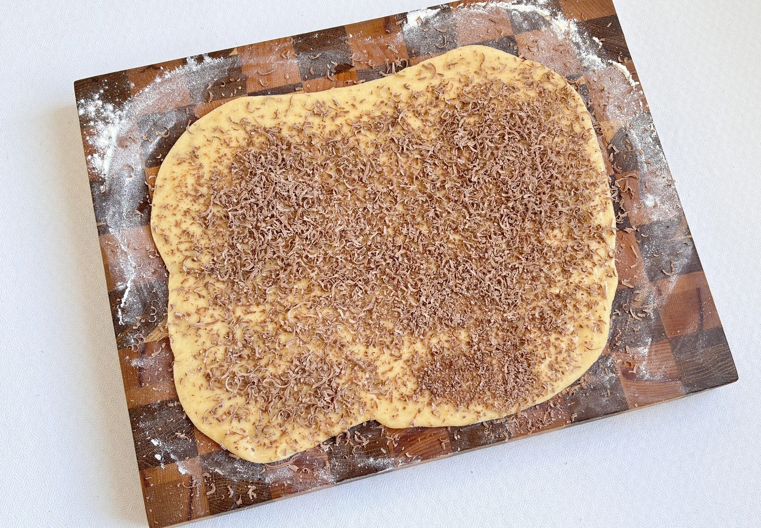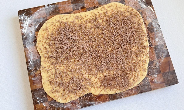 Тесто поделите на 2 части. Одну из частей раскатайте в пласт, смажьте растопленным сливочным маслом и натрите шоколад. Закрутите тесто в рулет.