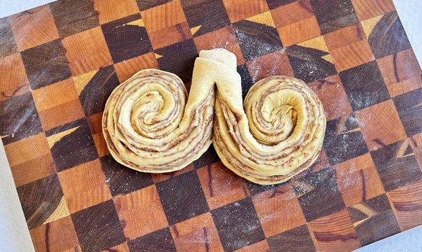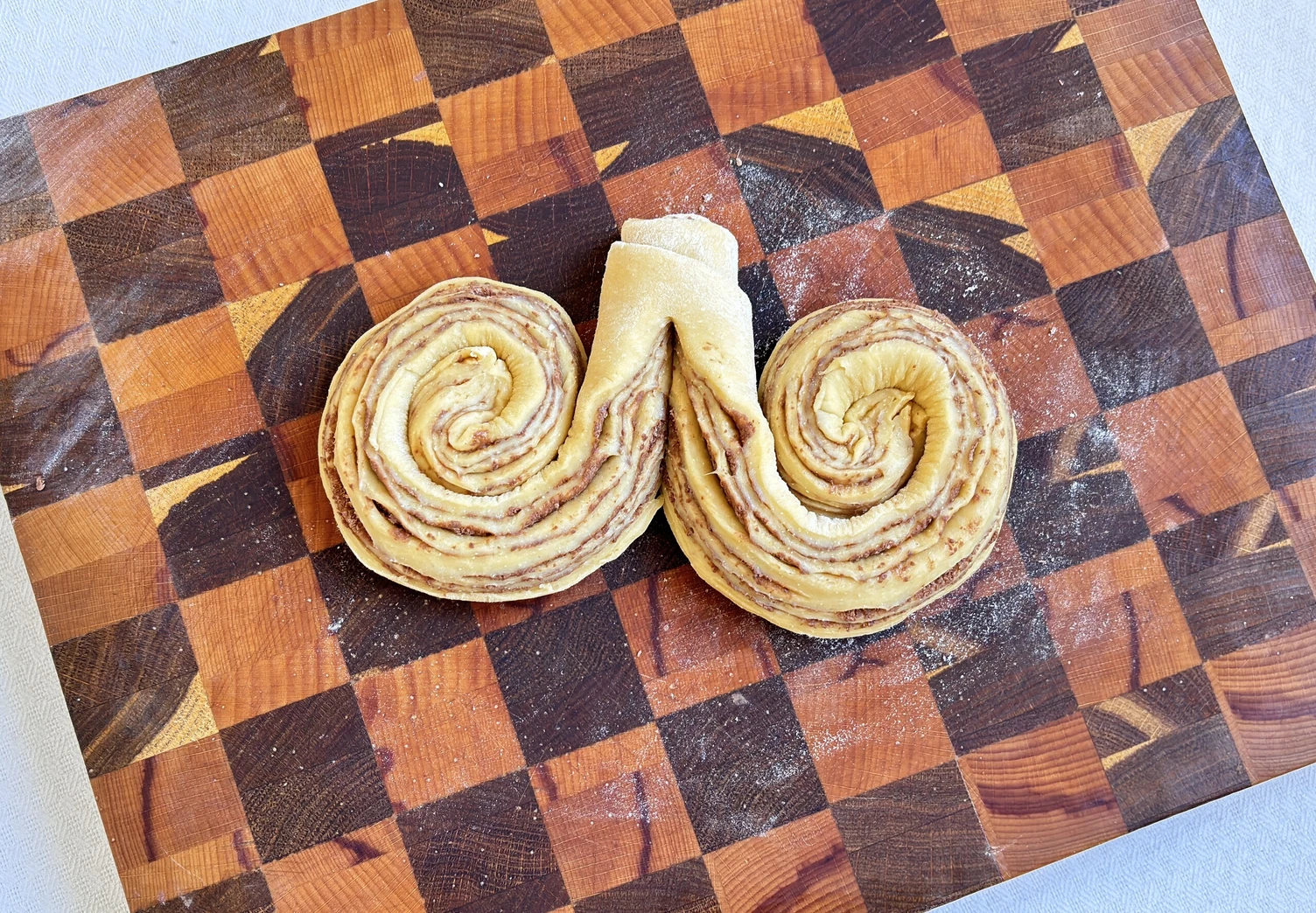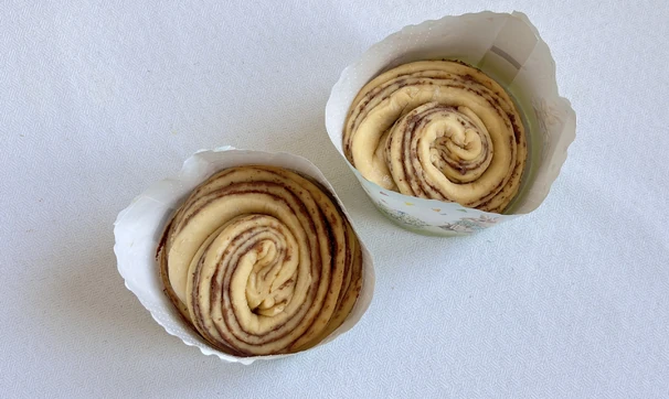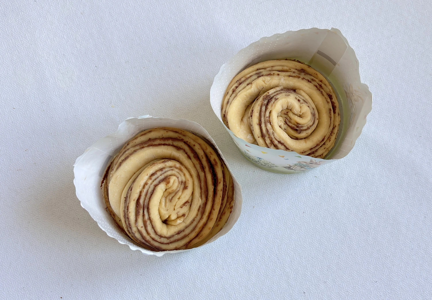 Рулет разрежьте вдоль на две части, не дорезая 3 см до конца. Каждую сторону закрутите в круг. Круги наложите друг на друга и переложите в формочки для выпекания. Оставьте куличи для расстойки ещё на 30–40 минут.