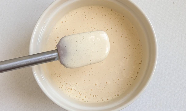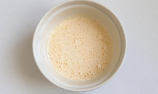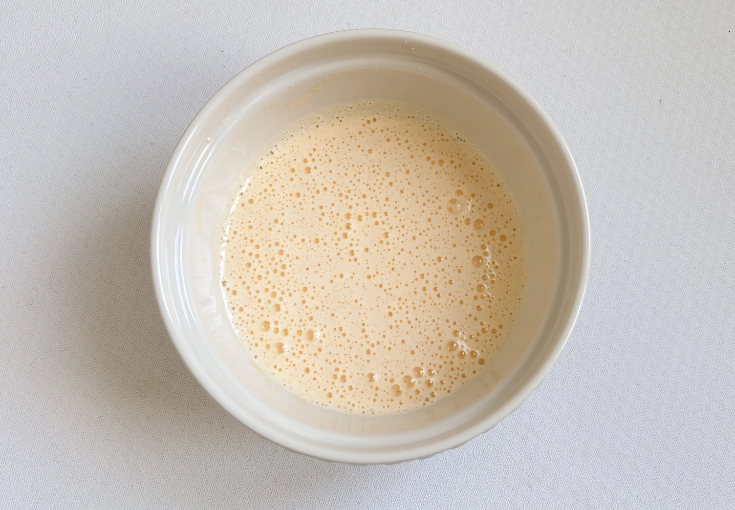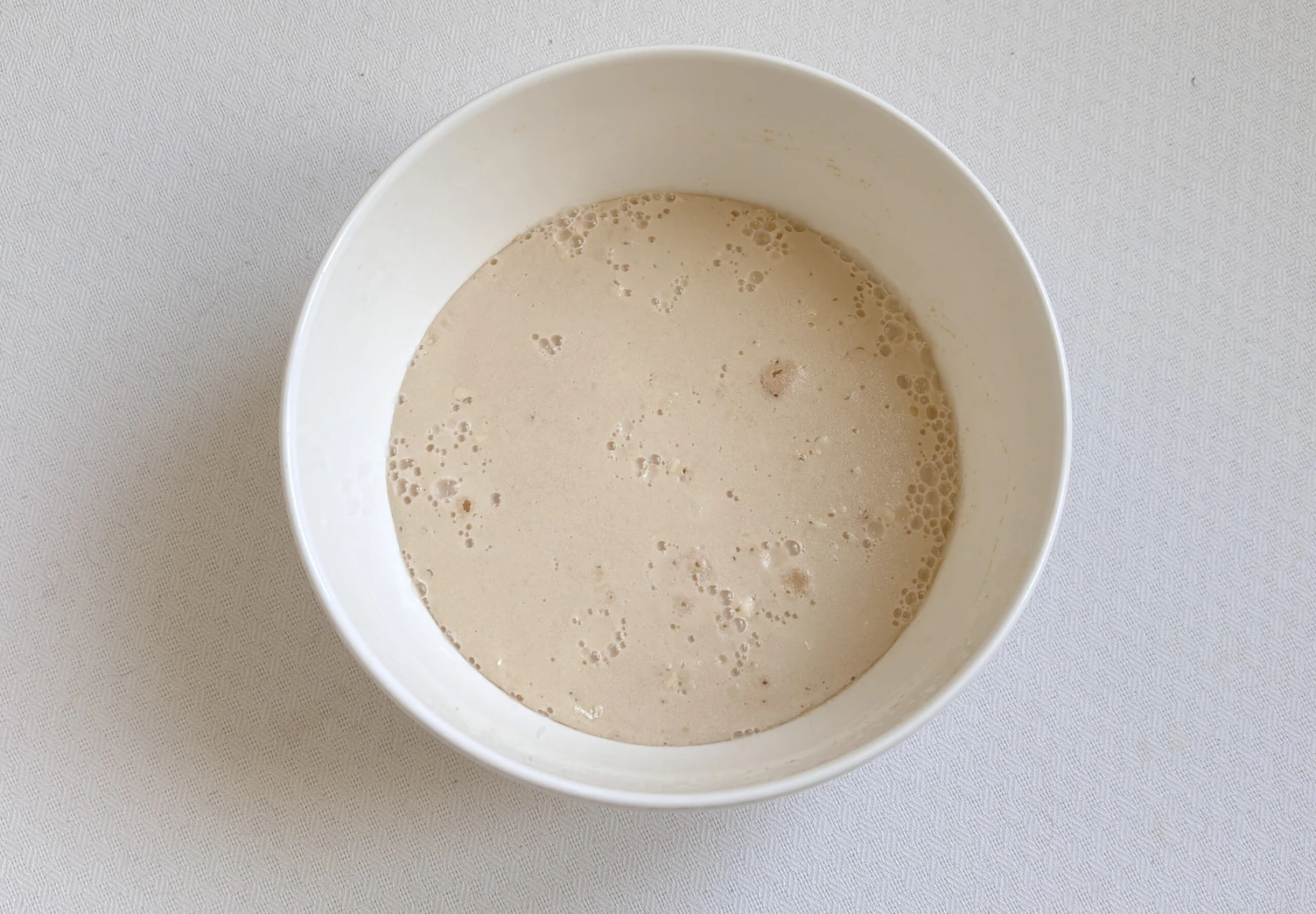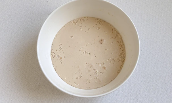 Для теста в миске смешайте тёплое молоко, дрожжи, 1 столовую ложку сахара, 2 столовые ложки муки. Оставьте опару в тёплом месте на 15–20 минут.