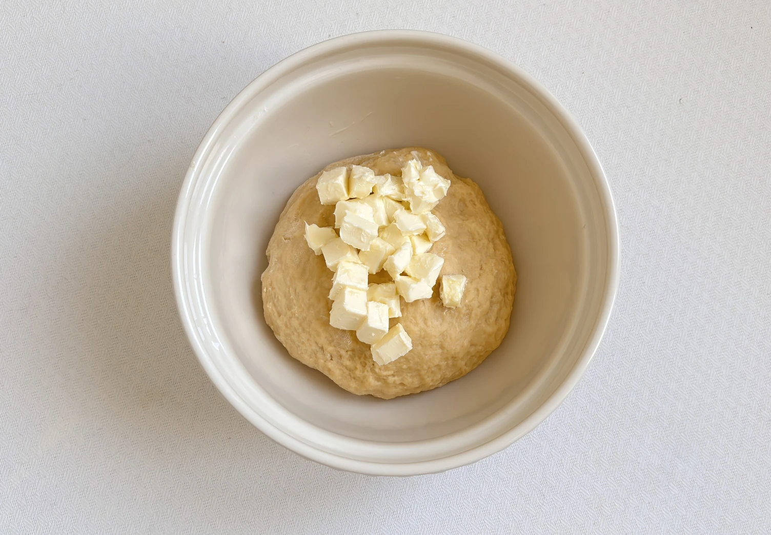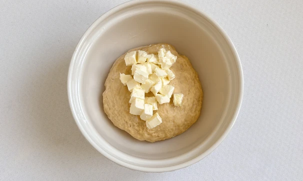 В тесто добавьте размягчённое сливочное масло и вымесите до однородности.