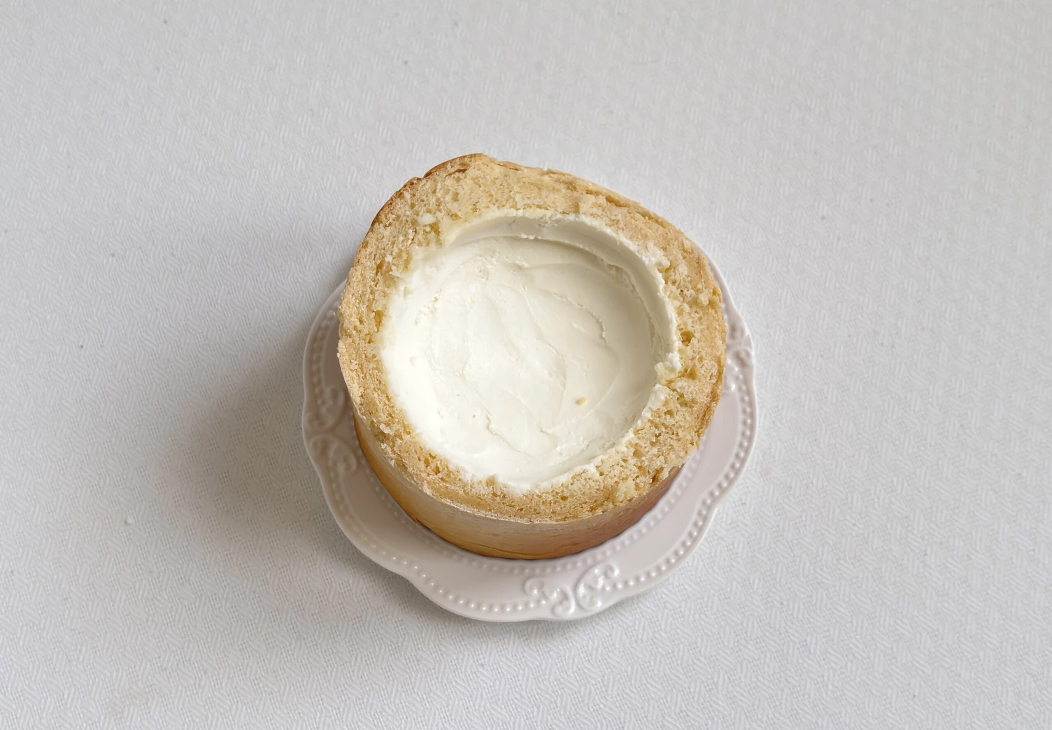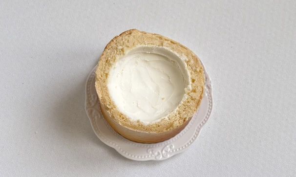 У готового кулича обрежьте верхушку, вырежьте глубокое отверстие, убрав из центра мякиш, и выложите в получившуюся выемку крем. Сверху накройте кулич обрезанной верхушкой.