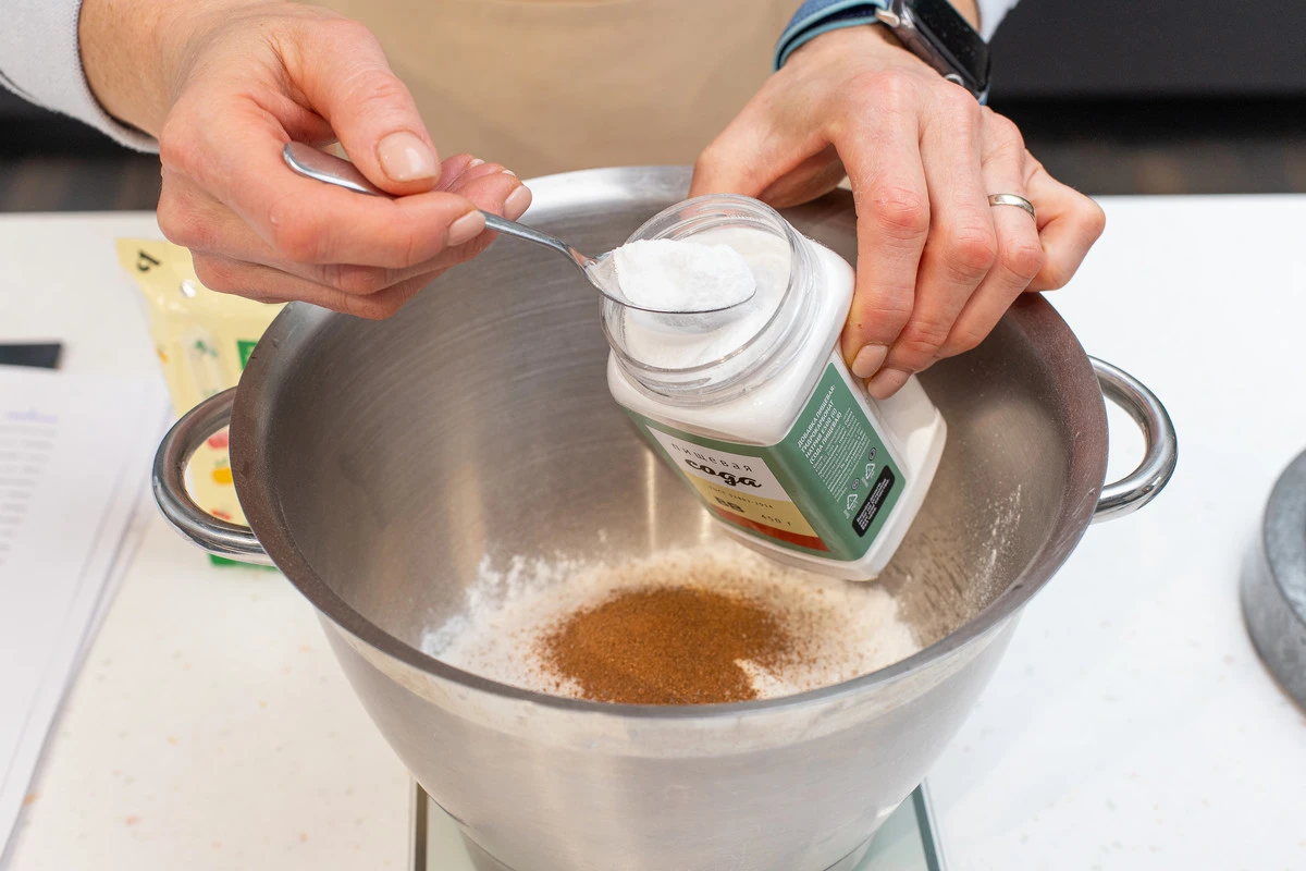 В чашу миксера насыпьте пшеничную и рисовую муку, сахар, молотую корицу, соду, разрыхлитель и соль.