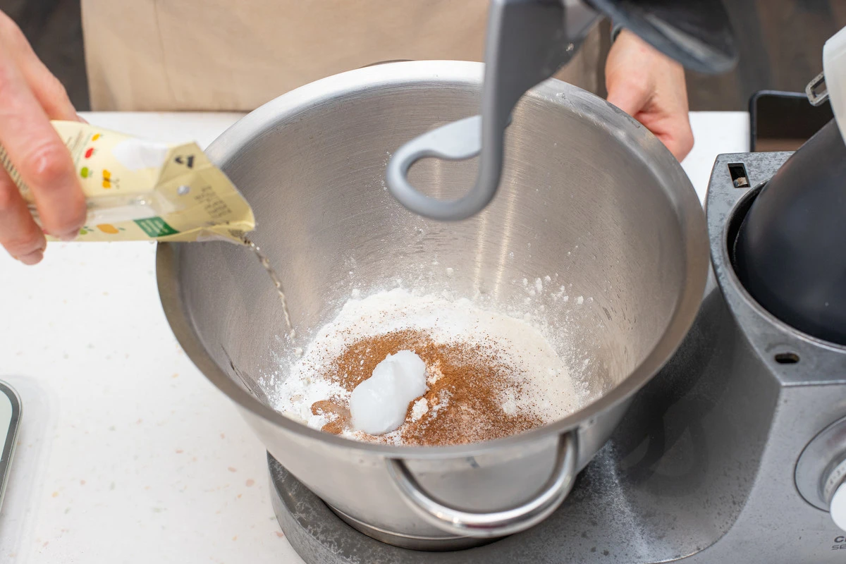 Добавьте кокосовое масло и яблочный сок. Перемешайте насадкой-крюком на низкой скорости миксера до однородности.
