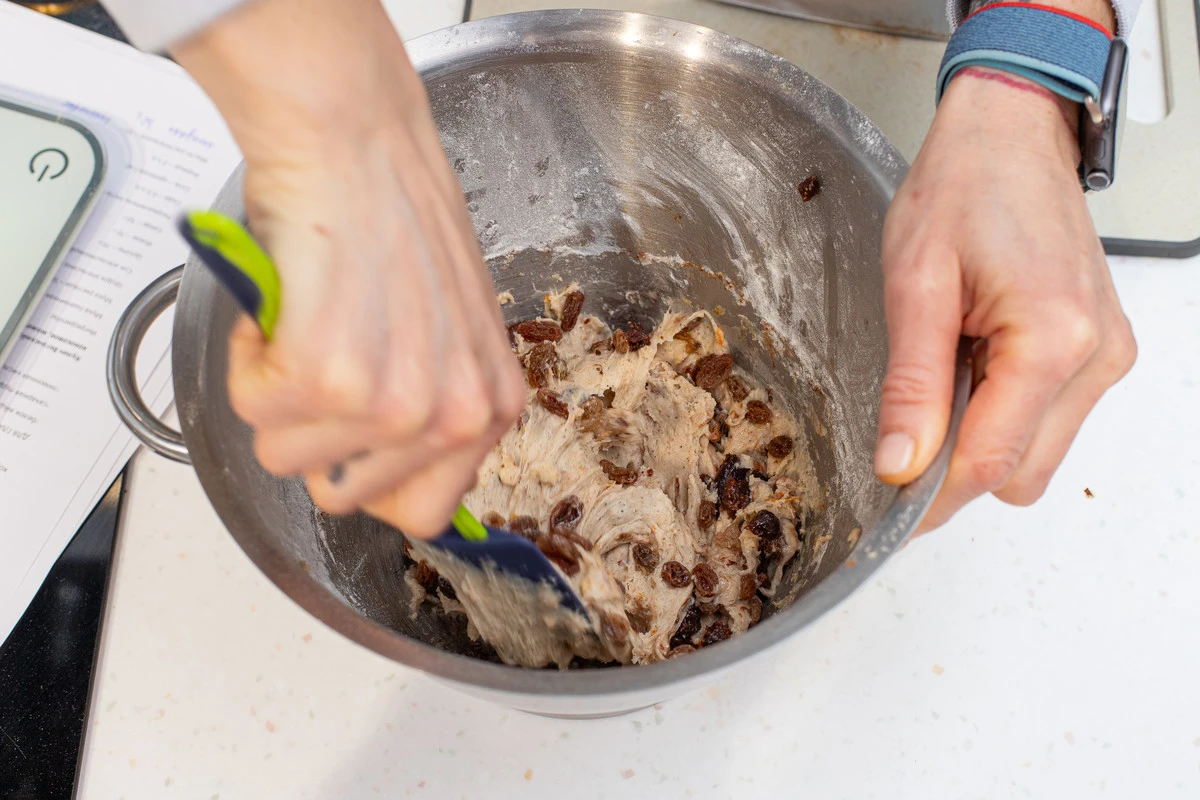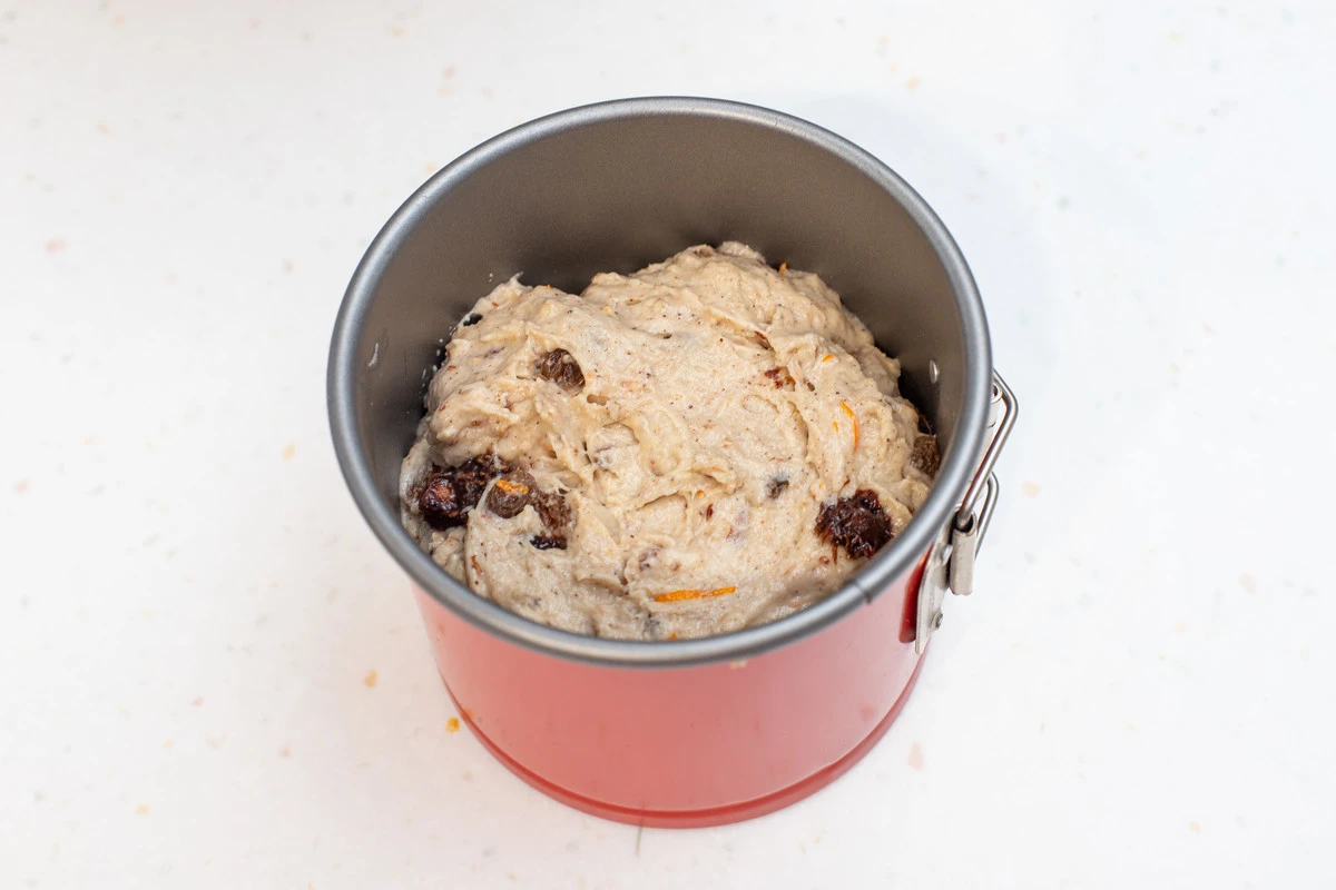 С сухофруктов слейте воду, обсушите бумажным полотенцем и добавьте в тесто. Хорошо перемешайте до соединения компонентов.