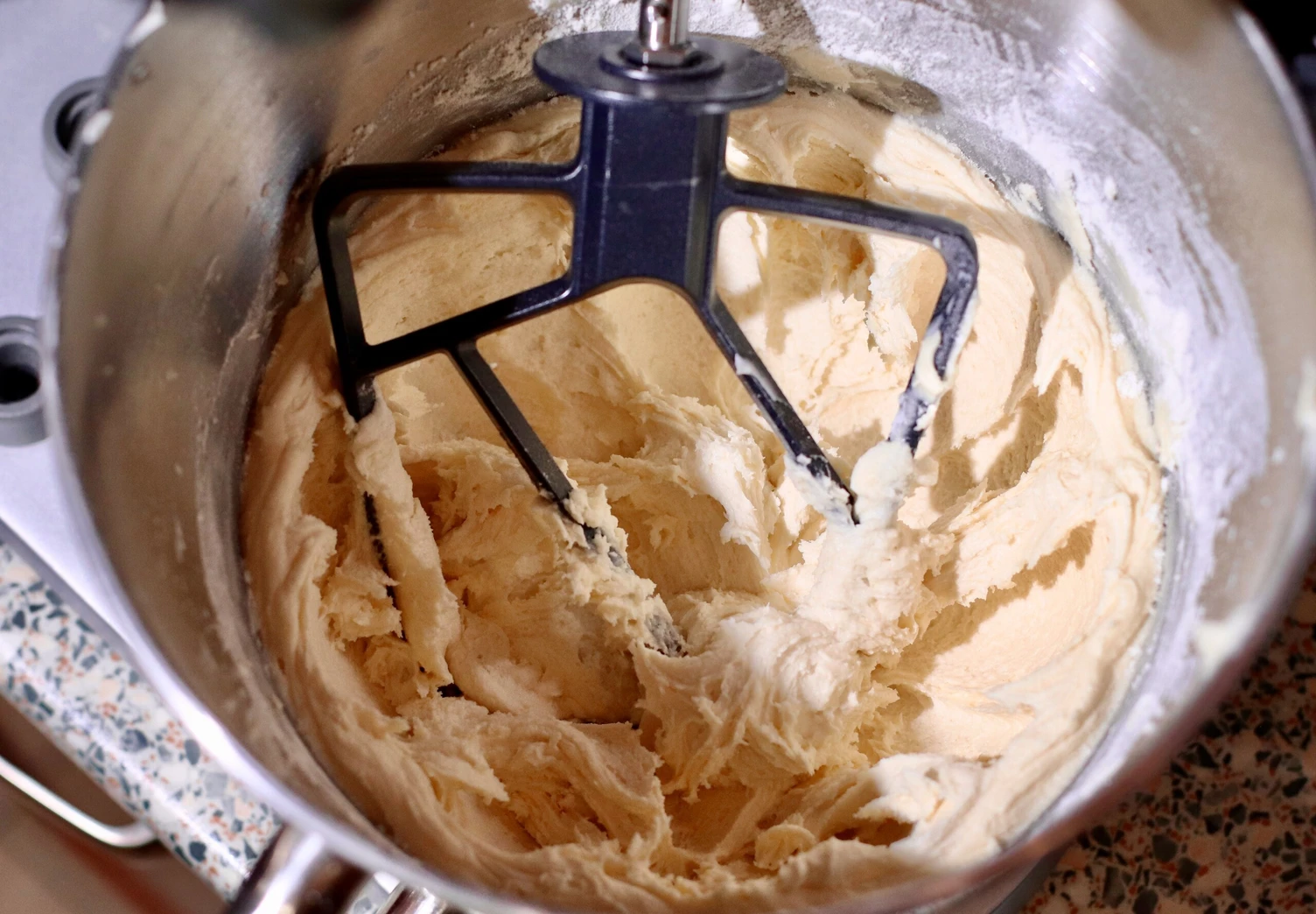 Взбейте масло комнатной температуры до посветления и пышности. Добавьте сахарную пудру и продолжайте взбивать ещё 2 минуты. Влейте белок, перемешайте до однородности. Вмешайте муку порциями в 2-3 приёма.