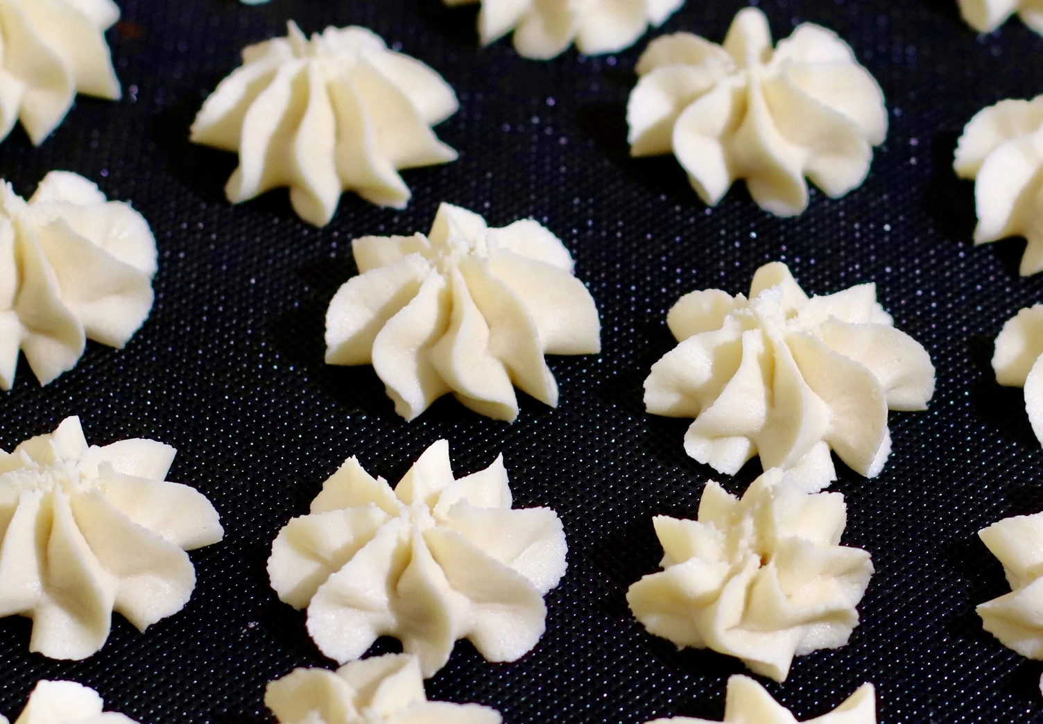 Используя кондитерский мешок с насадкой «закрытая звезда», отсадите печенье на противень, застеленный силиконовым ковриком.