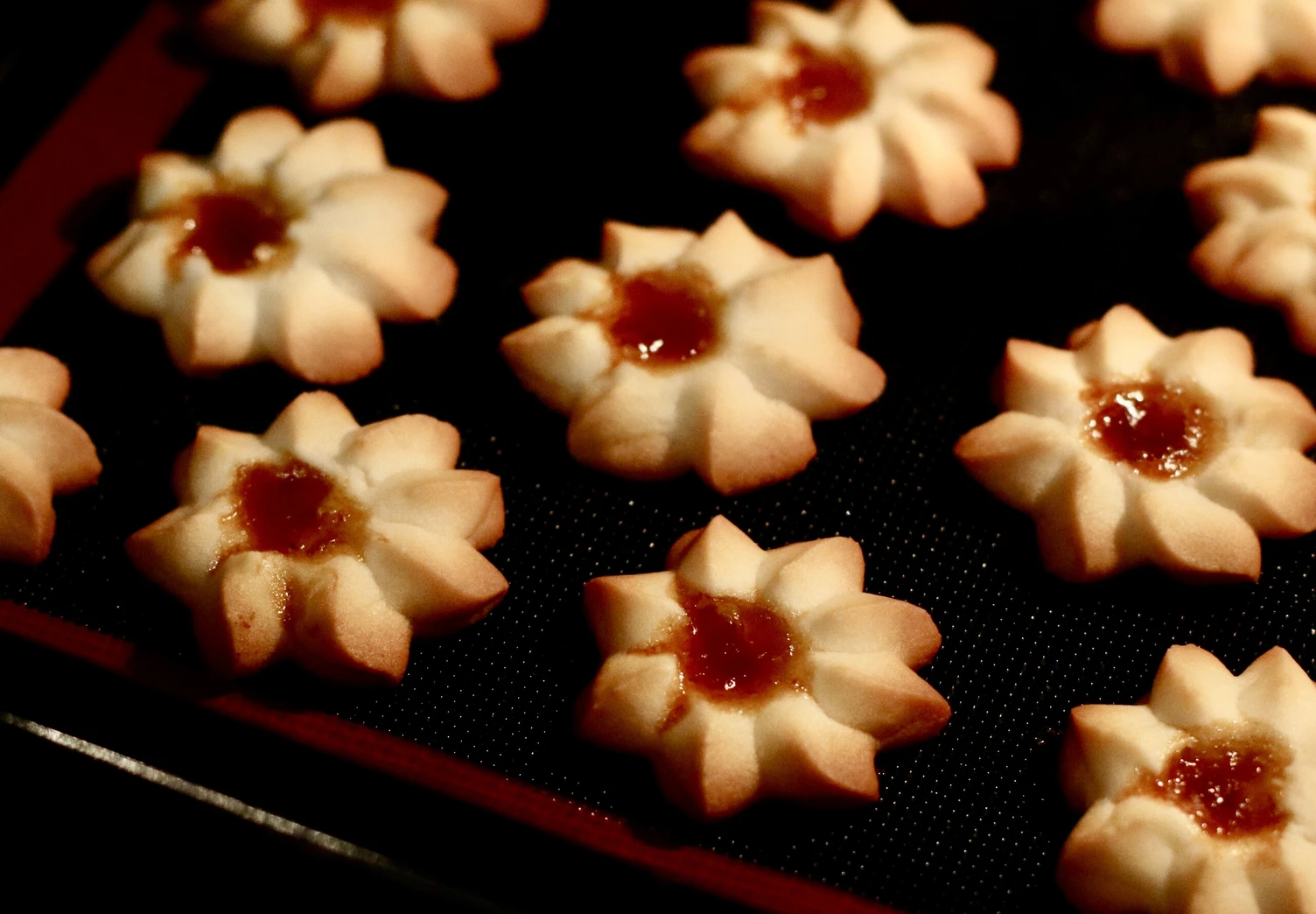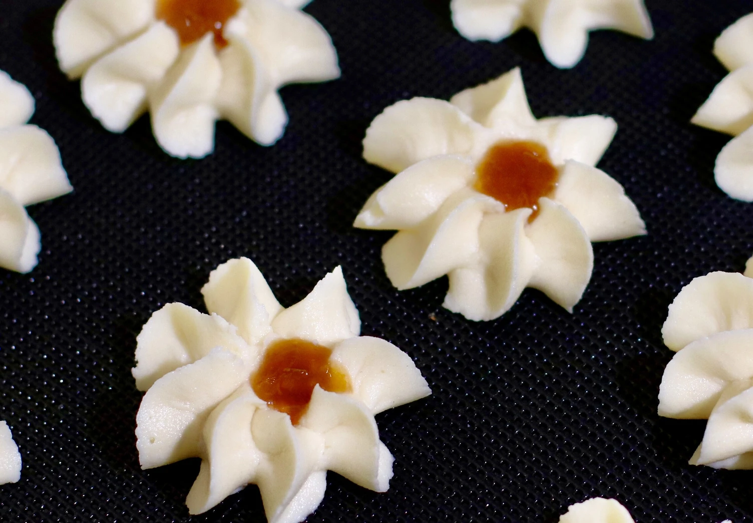 Сделайте в печенье углубления ложкой, смоченной в воде, и добавьте немного абрикосового джема.