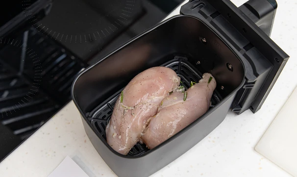 Выложите куриное филе в чашу аэрогриля и поставьте запекаться на 25 минут при 250 °C.