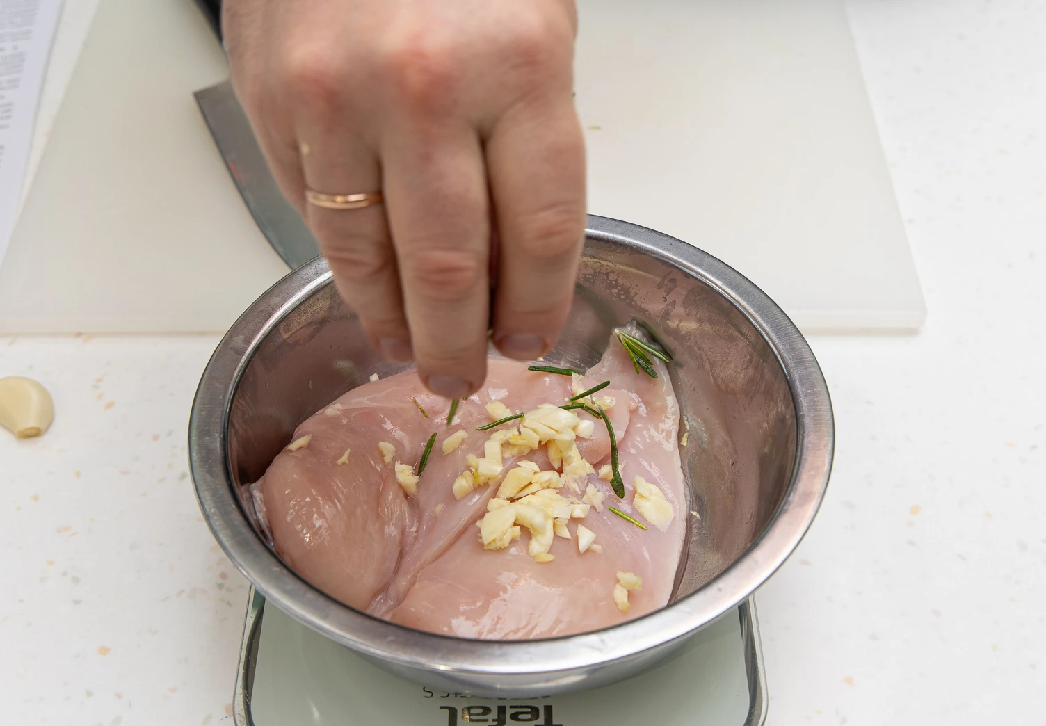 Разрежьте куриное филе вдоль и выложите в глубокую миску. Чеснок мелко порубите.