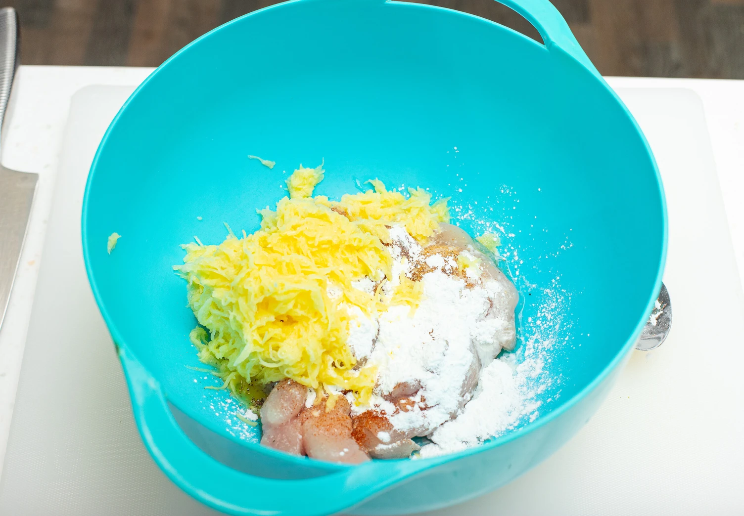 Смешайте куриное филе с картофелем, крахмалом, солью, яйцом, специями.