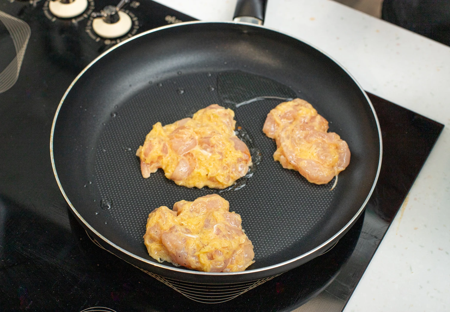 Жарьте куриные оладьи на растительном масле с двух сторон до золотистой корочки. После того как перевернёте их на вторую сторону, накройте сковороду крышкой — так оладьи хорошо прожарятся.