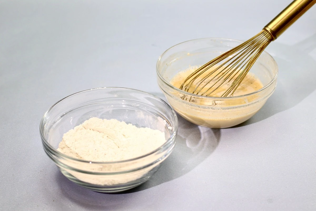 Смешайте в одной миске половину количества муки и специи, а в другой объедините яйца, оставшуюся муку и воду.