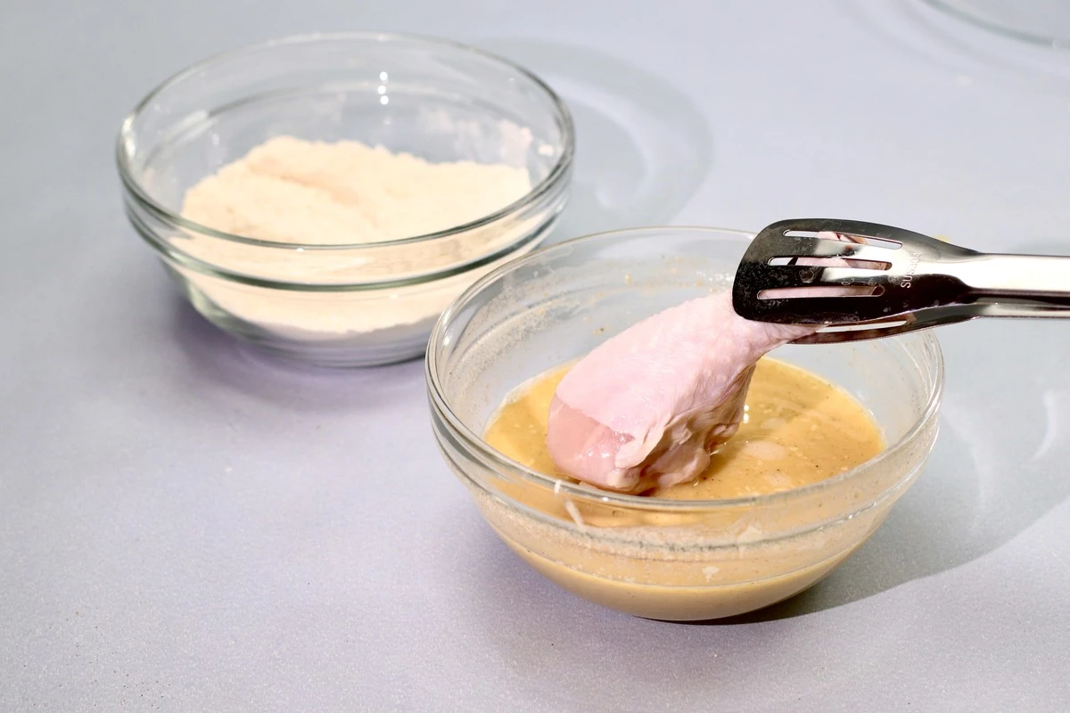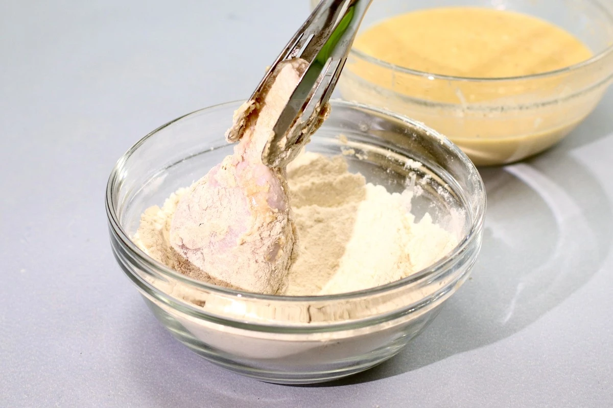 Сначала погрузите куриную ножку в тесто.