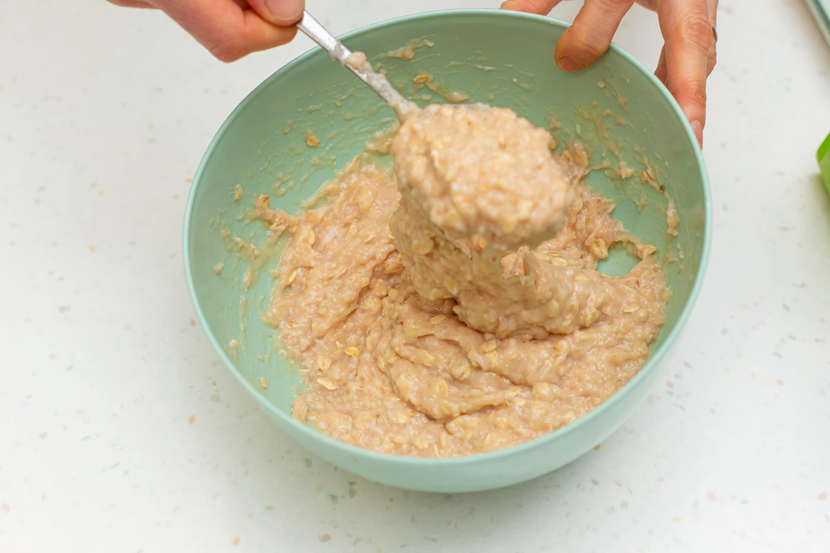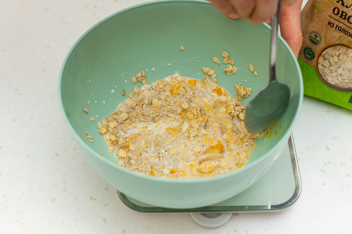 Овсяные хлопья залейте молоком, добавьте яйцо и соль и перемешайте.
