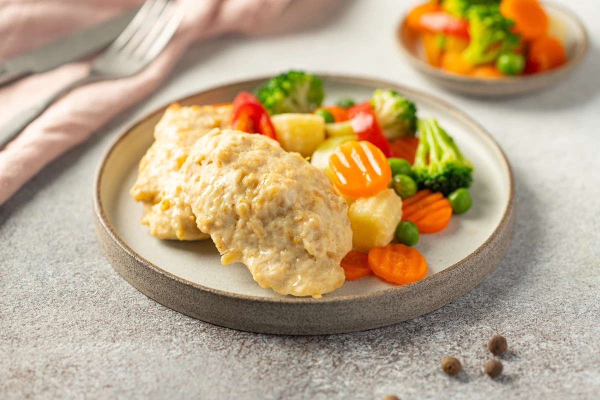 Подавайте котлеты с овощами на пару (им достаточно 5-7 минут приготовления) или салатом из свежих овощей. Кстати, во ВкусВилле вы можете купить котлеты с овсяными хлопьями, которые нужно только доготовить — все необходимые ингредиенты в них уже добавлены.