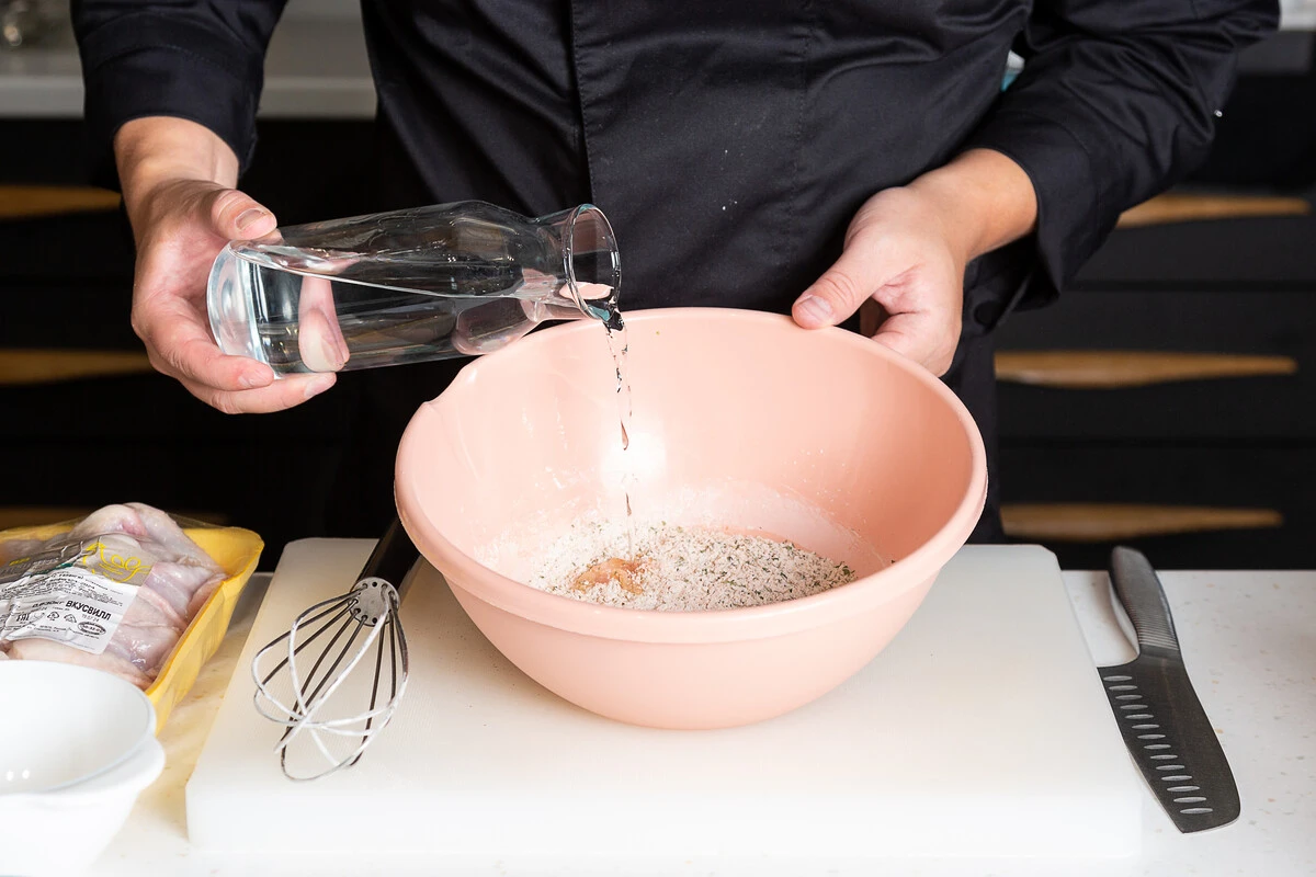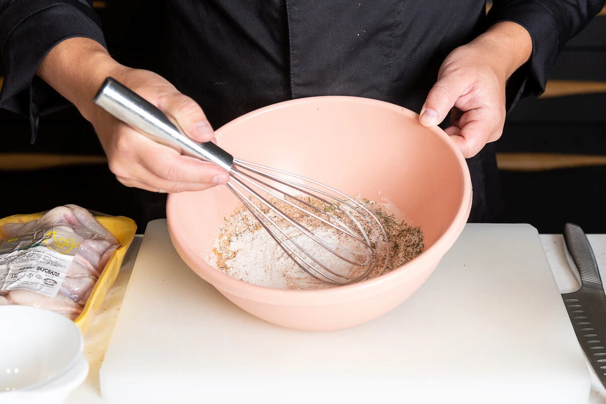 Насыпьте в миску крахмал. Добавьте все специи и перемешайте венчиком.