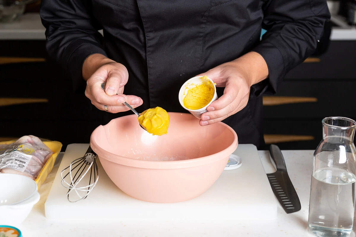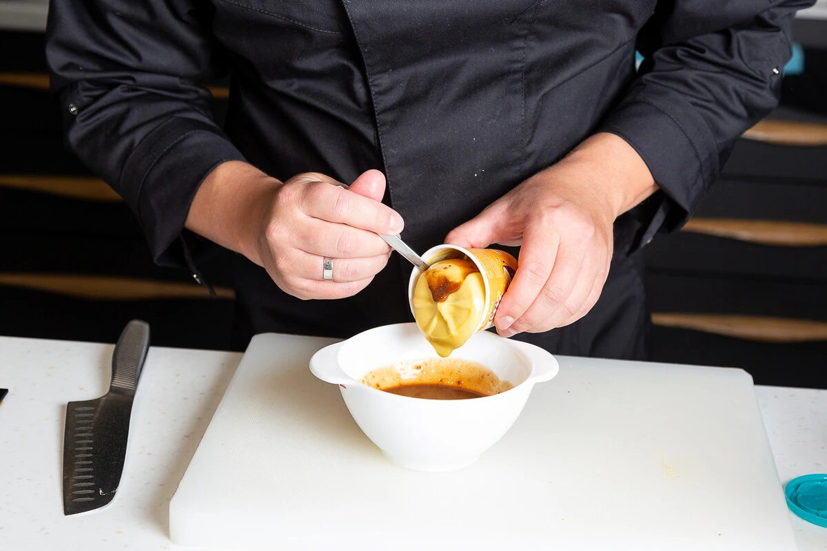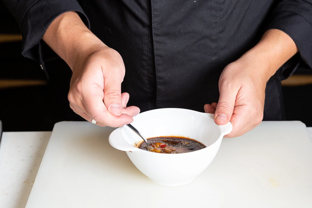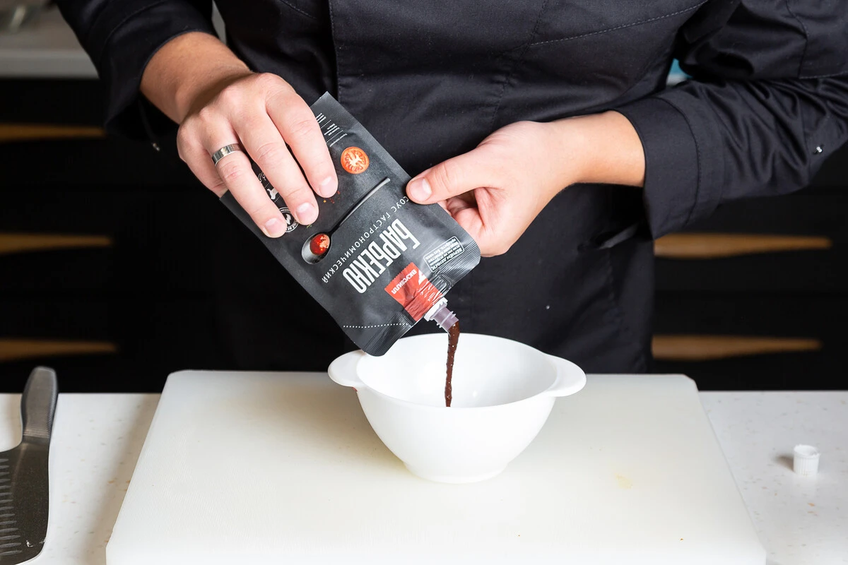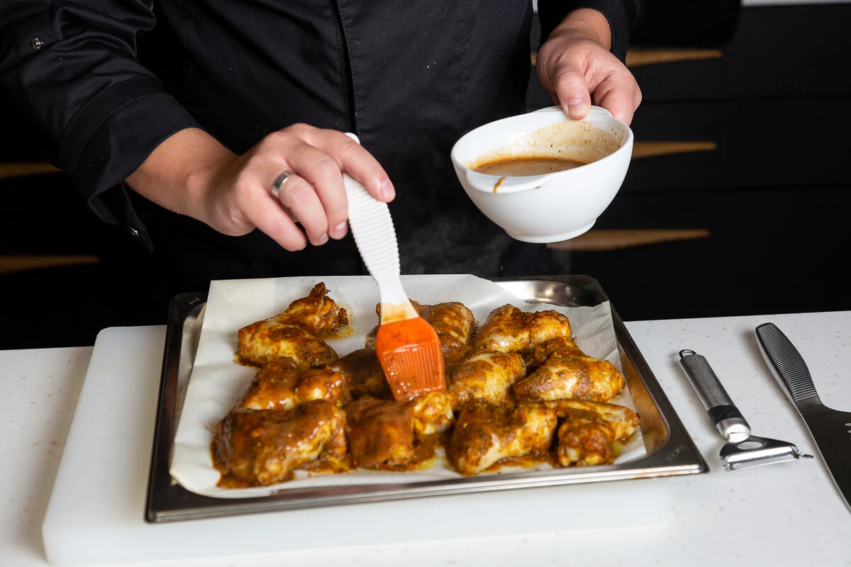 Пока запекаются крылья, сделайте соус для глазировки. Налейте в миску барбекю.